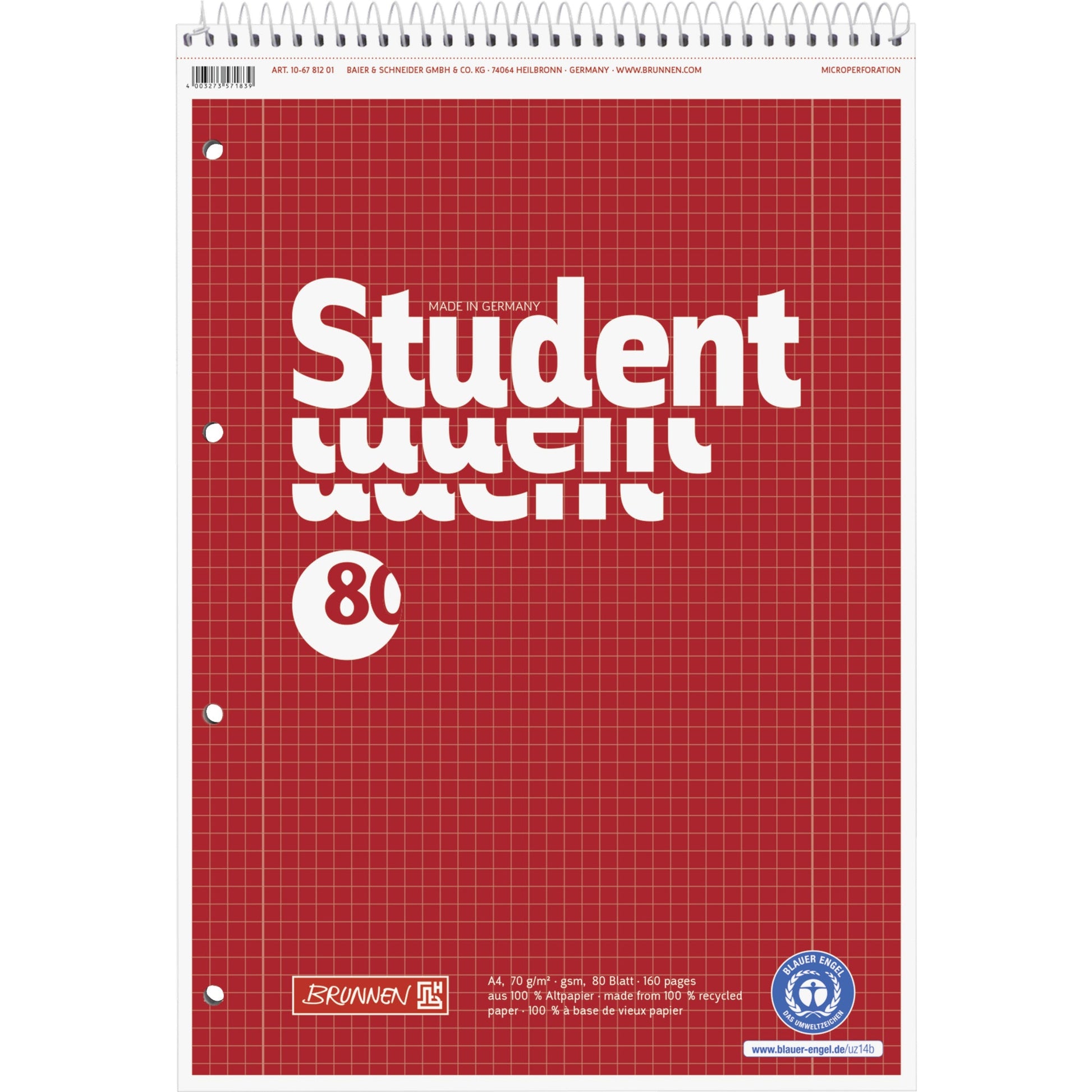 Bezeichnung: BRUNNEN Notizblock Student Recycling DIN A4 kariert mit Rand innen/außen 80 Bl.