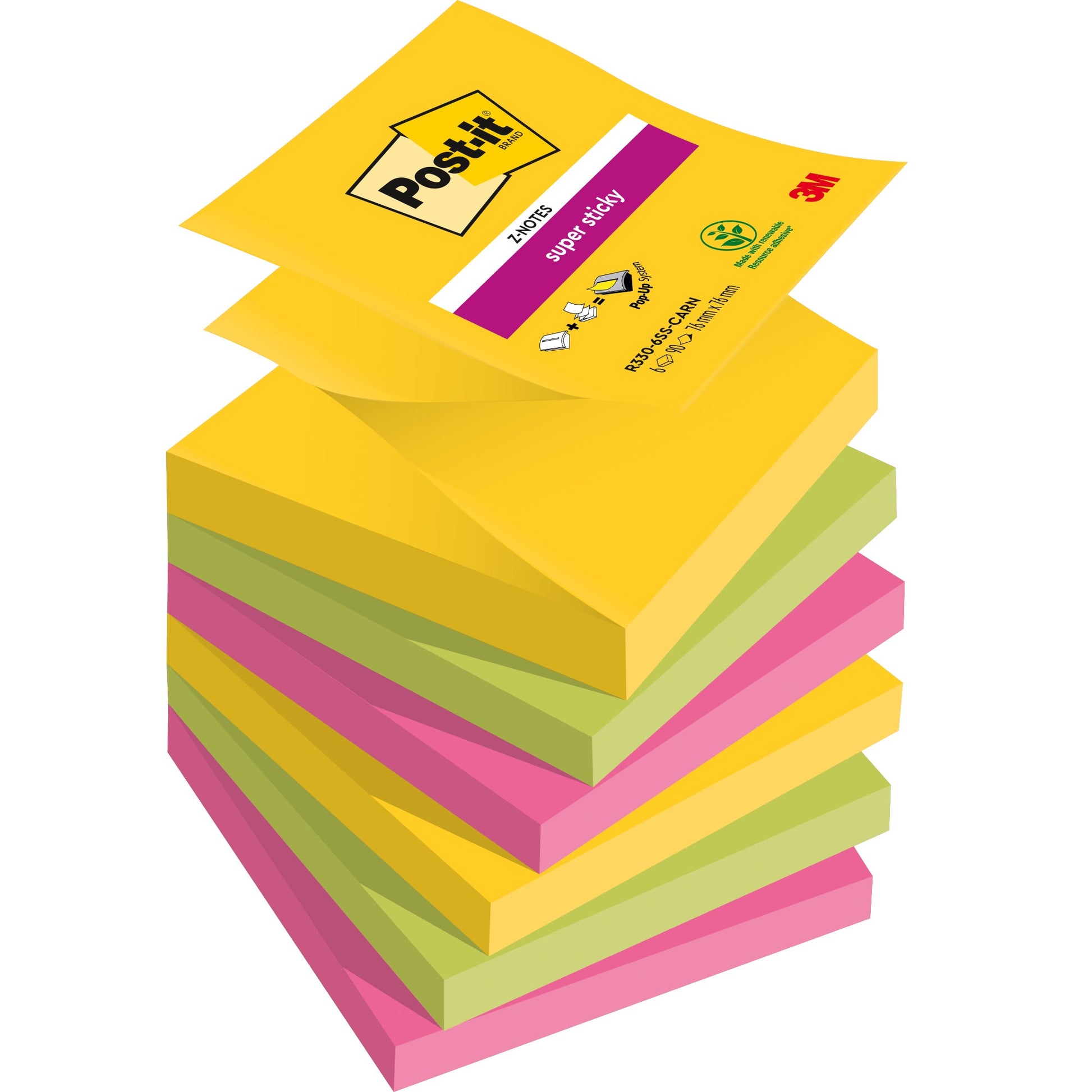 Bezeichnung: Post-it® Haftnotiz Super Sticky Z-Notes Carnival Collection 76 x 76 mm (B x H) ultragelb, limonengrün, powerpink 90 Bl./Block 6 Block/Pack.