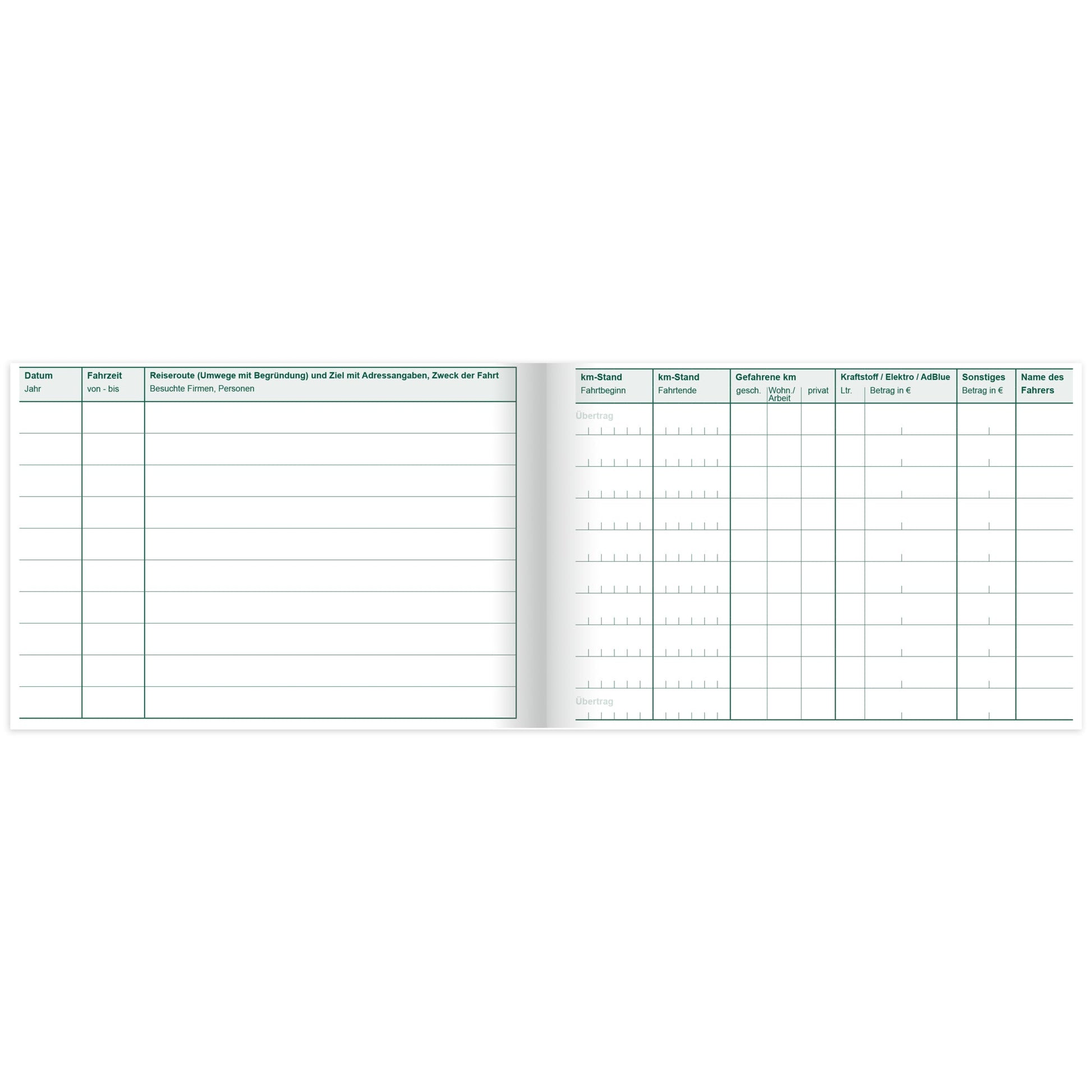 grünDieses Fahrtenbuch für PKW eignet sich besonders als Steuernachweis für das Finanzamt. Erfasst werden alle Fahrten mit Datum, Abfahrt- und Ankunftszeiten, Zielort und Reiseroute so wie Anlass der Fahrt (aufgesuchter Geschäftspartner). Km-Stand bei Abfahrt und Ankunft nebst Unterscheidung zwischen betrieblicher und privater Fahrt, Kraftstofftankungen und Bemerkungen/Name des Fahrers.