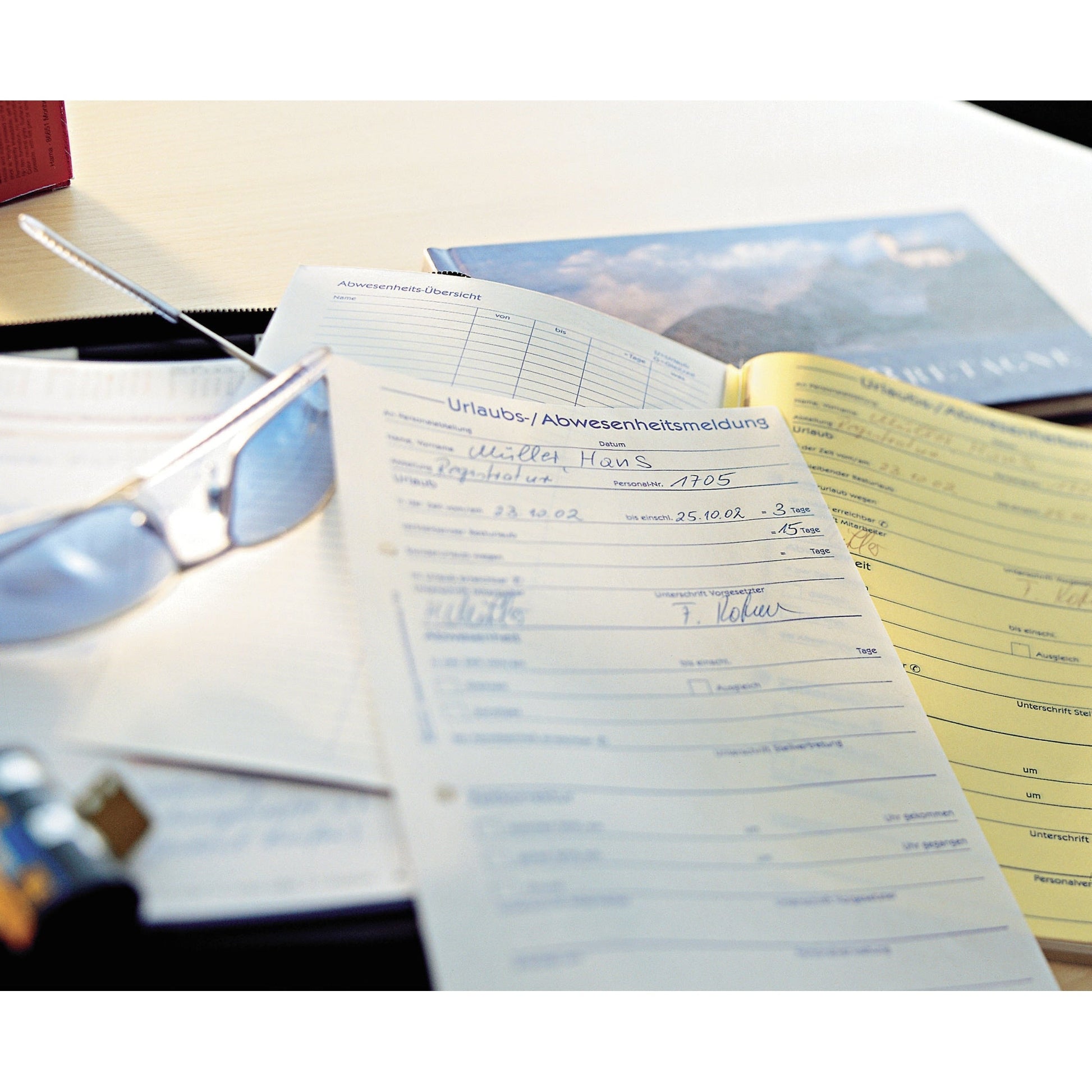 gelbDie Urlaubs-/Abwesenheitsmeldung eignet sich ideal für die Zeiterfassung in der Personalverwaltung. Es kann als Abwesenheitsmeldung oder Urlaubsantrag eingesetzt werden. Die Urlaubsanträge und Abwesenheitsmeldungen von Avery Zweckform sind zuverlässige, bewährte Hilfen für Buchhaltung und Personalwesen.