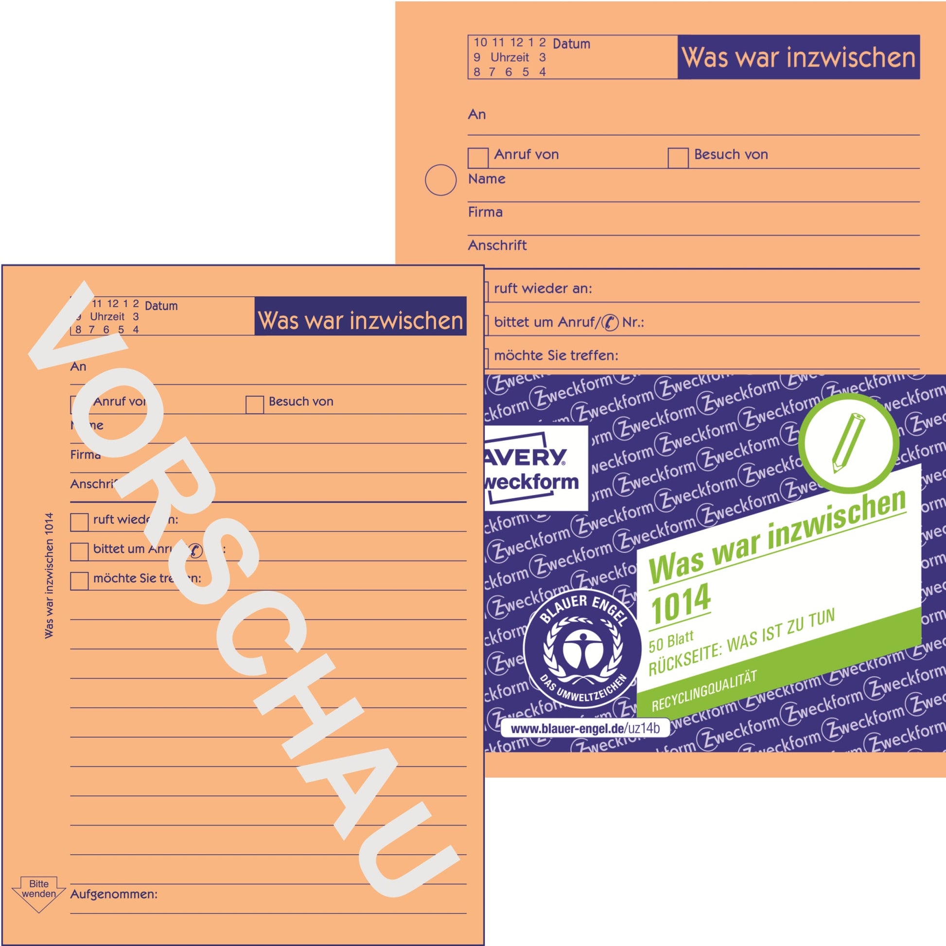 orange, gelb (freie Farbauswahl nicht möglich)Der "Was war inzwischen/was ist zu tun" Vordruck von Avery Zweckform ist auffällig orange gestaltet und eignet sich daher besonders zur Weitergabe von Informationen bei Abwesenheit. Die Notizformulare und Vordrucke von Avery Zweckform sind praktische, bewährte Hilfen für Ihre Kommunikation und Notizen im Büro und zu Hause.