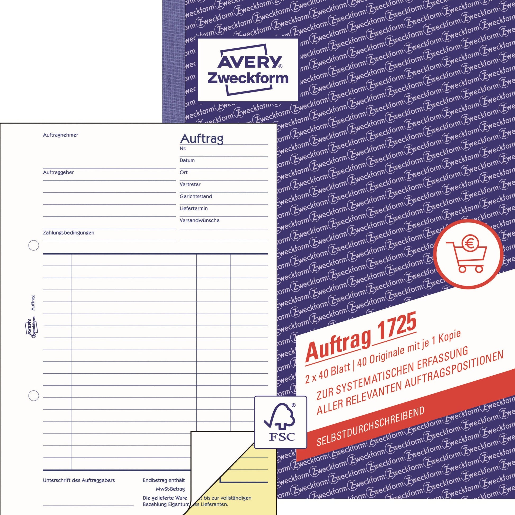 Bezeichnung: Avery Zweckform Auftragsformular 1725 DIN A5 54g/m² selbstdurchschreibend 1 Durchschlag handschriftlich, Schreibmaschine gelb 2 x 40 Bl.