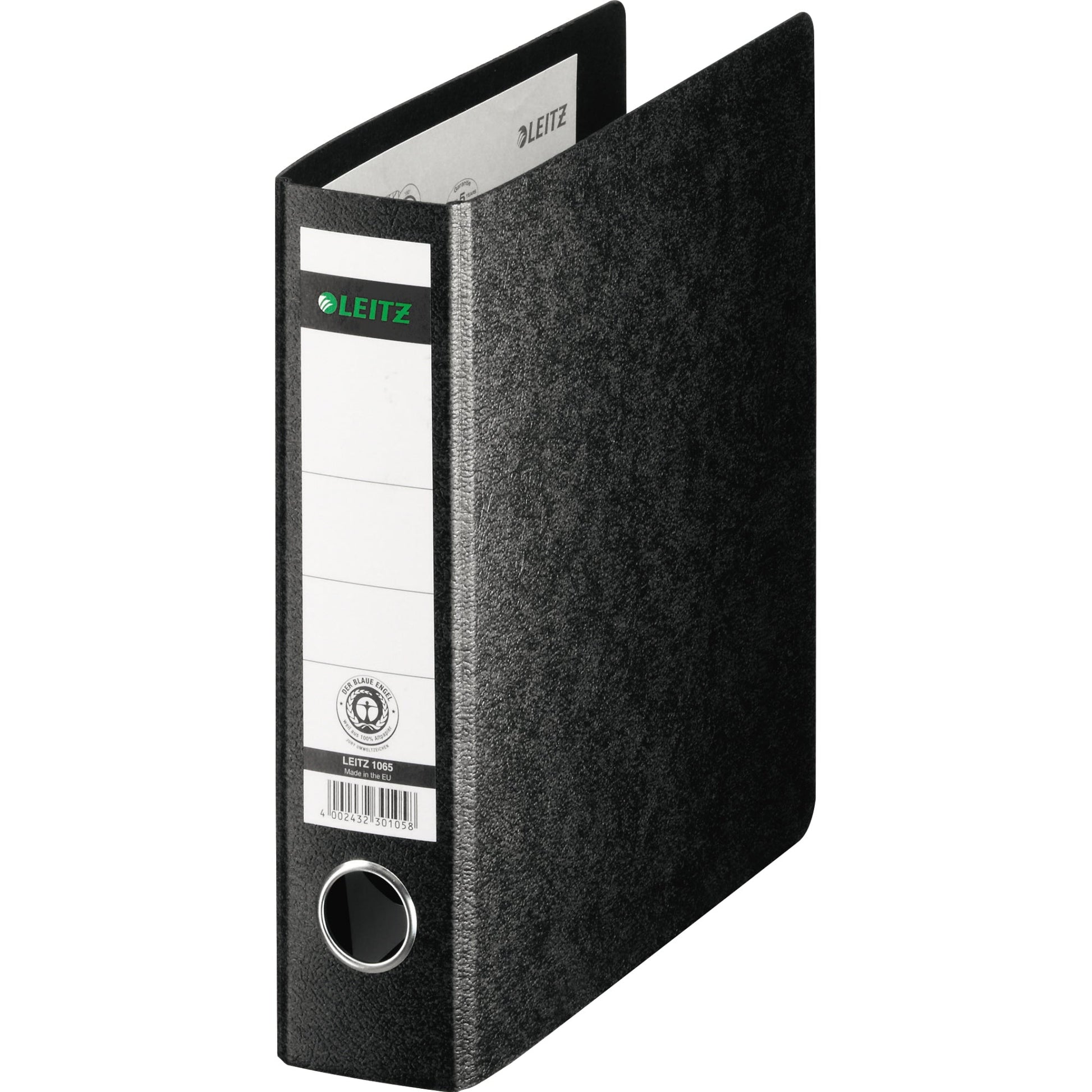 Bezeichnung: Leitz Ordner 60mm DIN A5 Rückenschild: geklebt ohne Schlitze Werkstoff: Hartpappe, recycelt Material außen: Papier Material innen: Papier schwarz