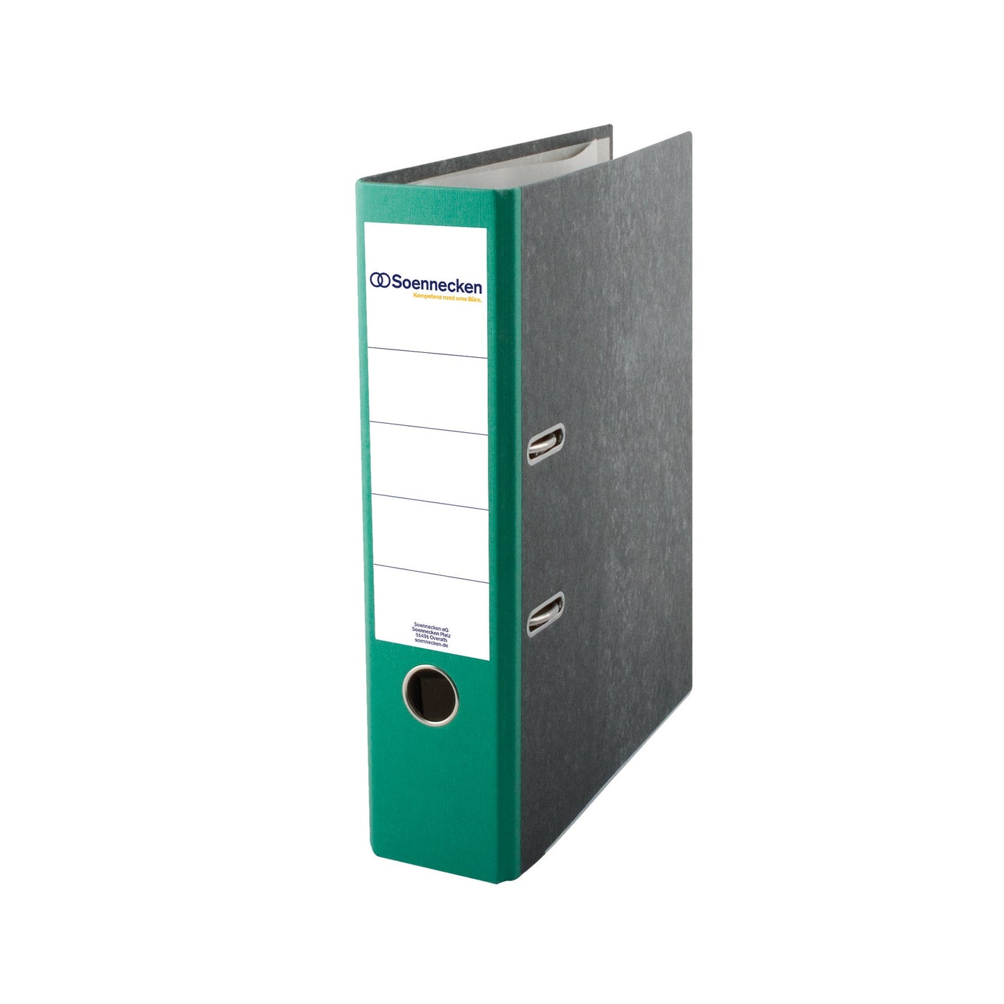 Bezeichnung: Soennecken Ordner 80mm DIN A4 Rückenschild: geklebt mit Schlitzen Werkstoff: Pappe Material außen: Papier Material innen: Papier grün