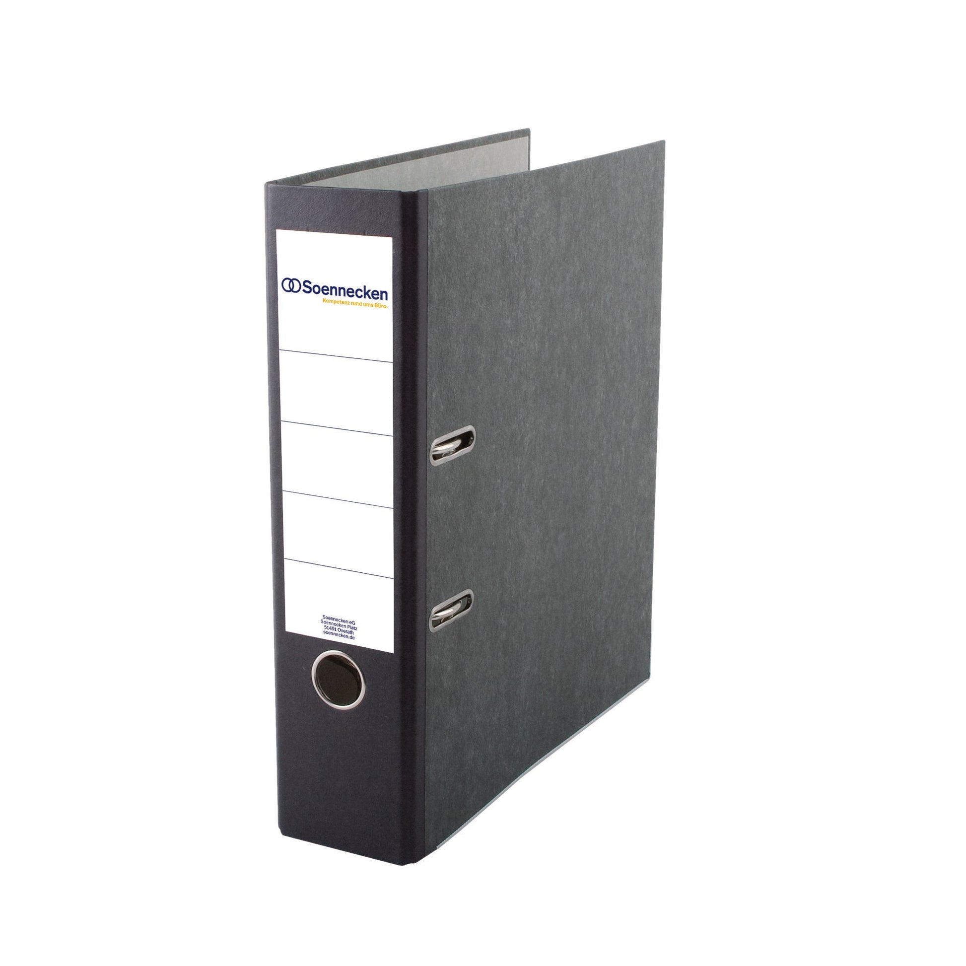 Bezeichnung: Soennecken Ordner 80mm DIN A4 Rückenschild: geklebt mit Schlitzen Werkstoff: Pappe Material außen: Papier Material innen: Papier schwarz