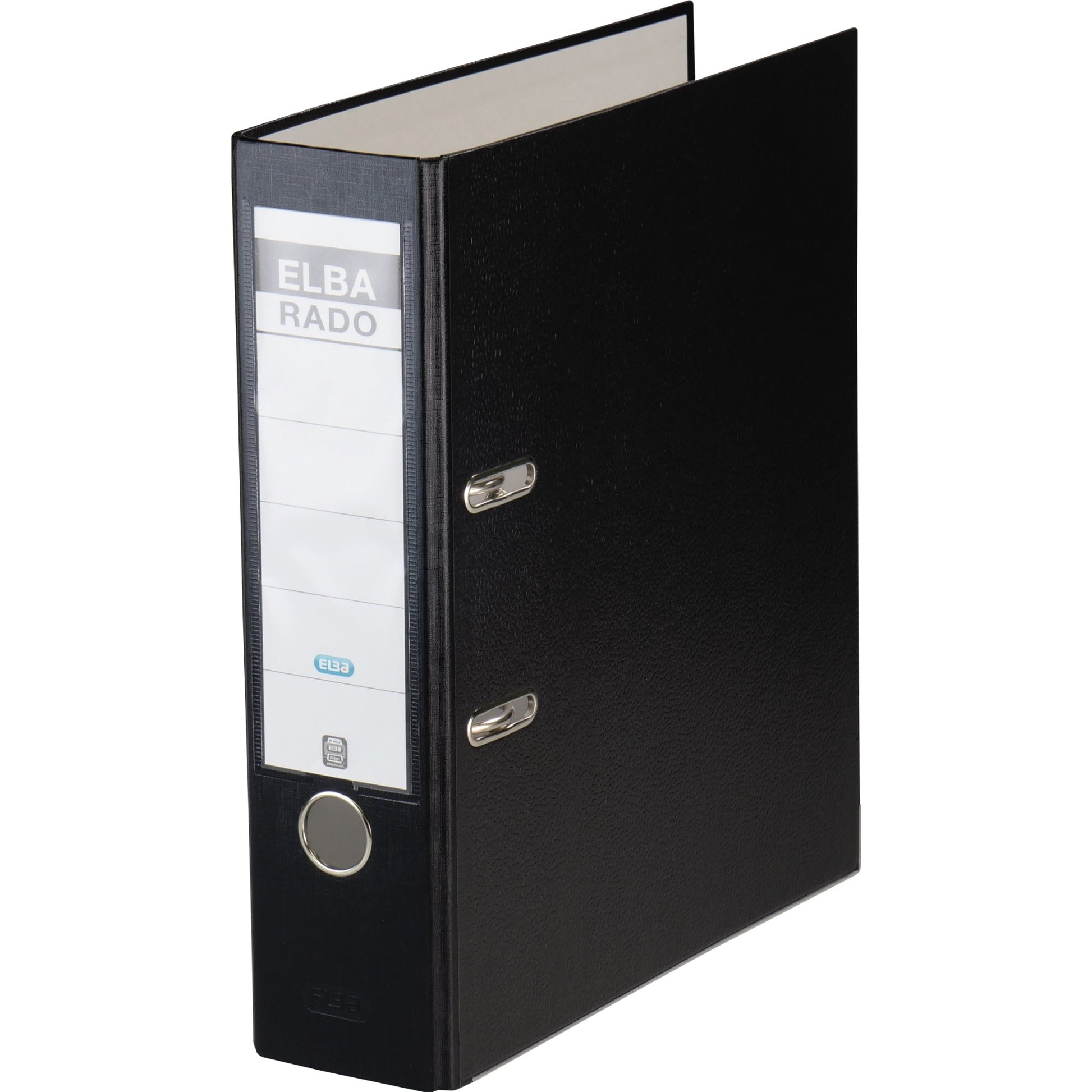 Bezeichnung: ELBA Ordner rado brillant 80mm DIN A4 Rückenschild: einsteckbar mit Schlitzen Werkstoff: Pappe Material außen: Acrylat/Papier Material innen: Papier schwarz