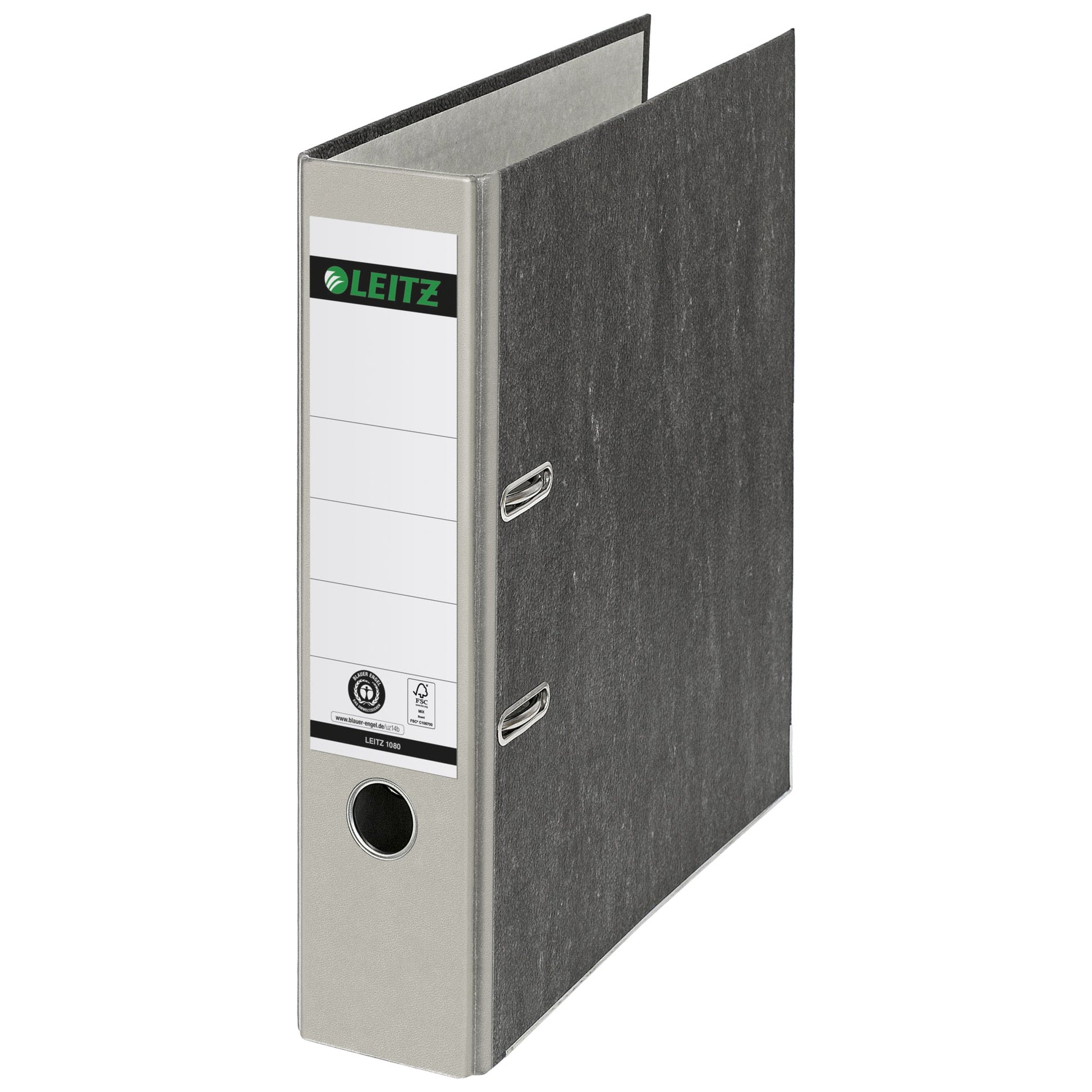 Bezeichnung: Leitz Ordner 80mm DIN A4 Rückenschild: geklebt mit Schlitzen Werkstoff: Graupappe, recycelt Material außen: Papier, recycelt Material innen: Papier, recycelt grau