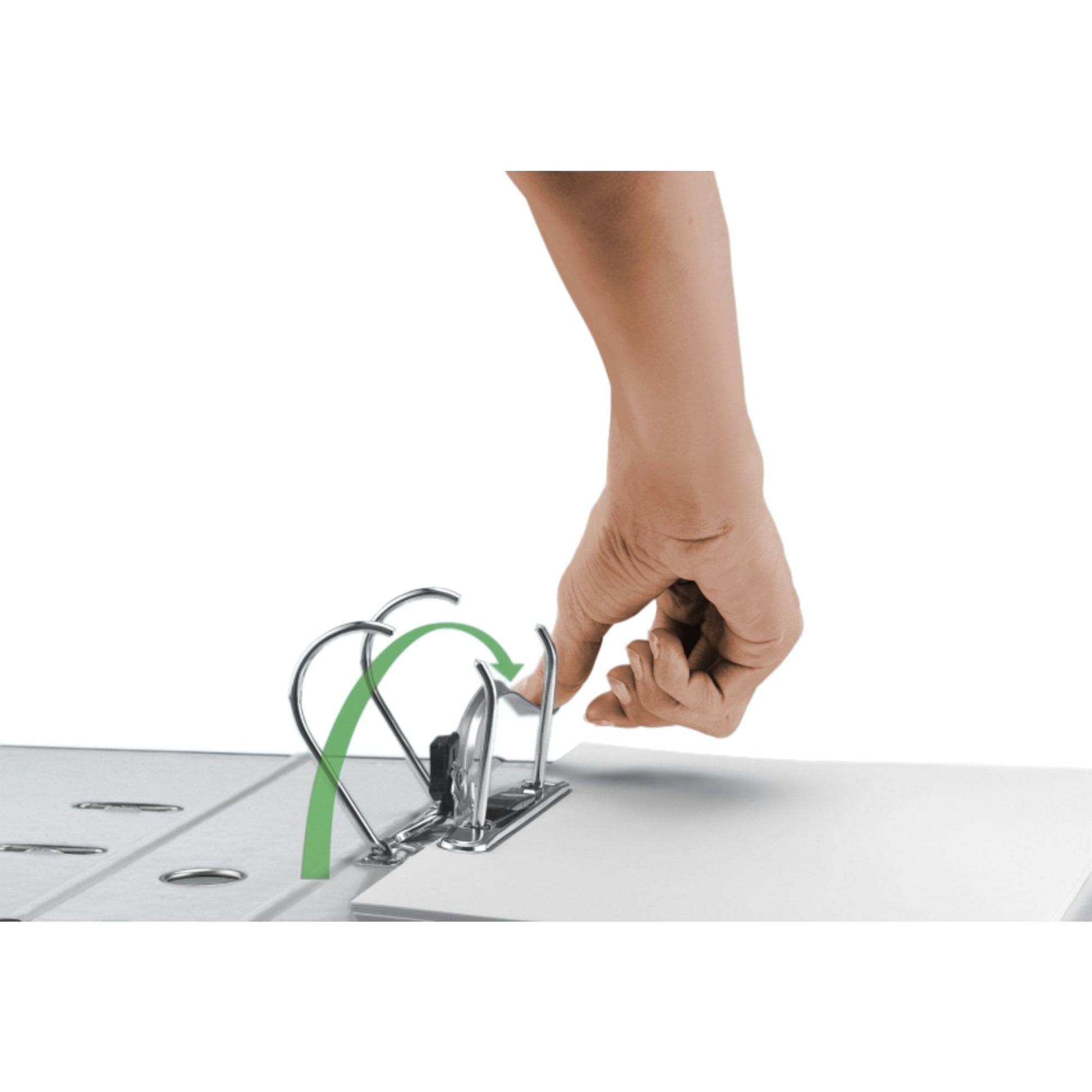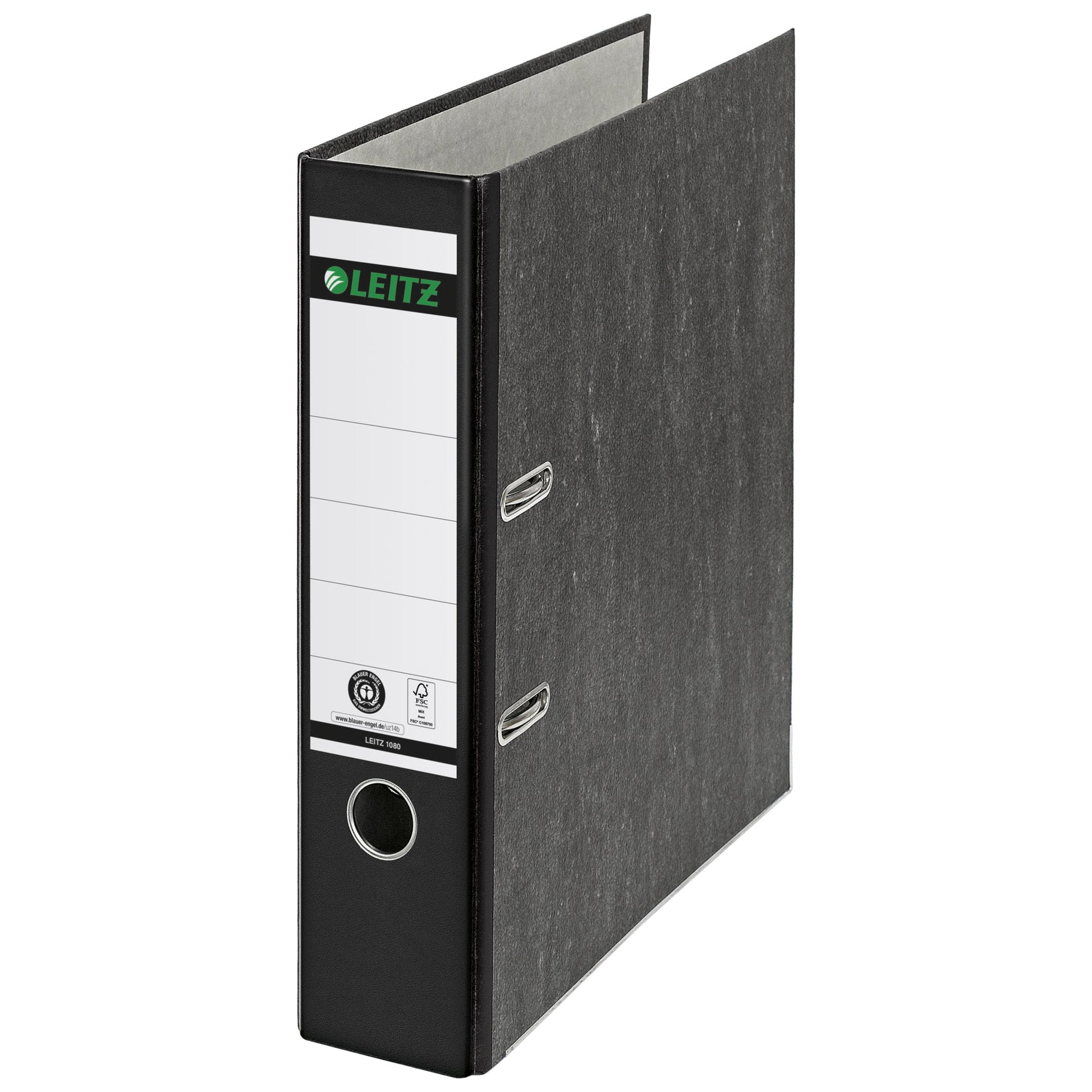 Bezeichnung: Leitz Ordner 80mm DIN A4 Rückenschild: geklebt mit Schlitzen Werkstoff: Graupappe, recycelt Material außen: Papier, recycelt Material innen: Papier, recycelt schwarz