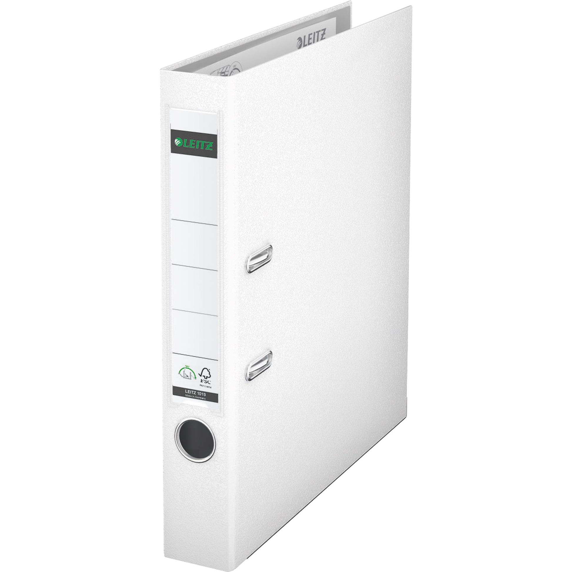 Bezeichnung: Leitz Ordner 52mm DIN A4 Rückenschild: einsteckbar mit Schlitzen Werkstoff: Graupappe, recycelt Material außen: Polypropylenfolie Material innen: Papier, PE beschichtet weiß