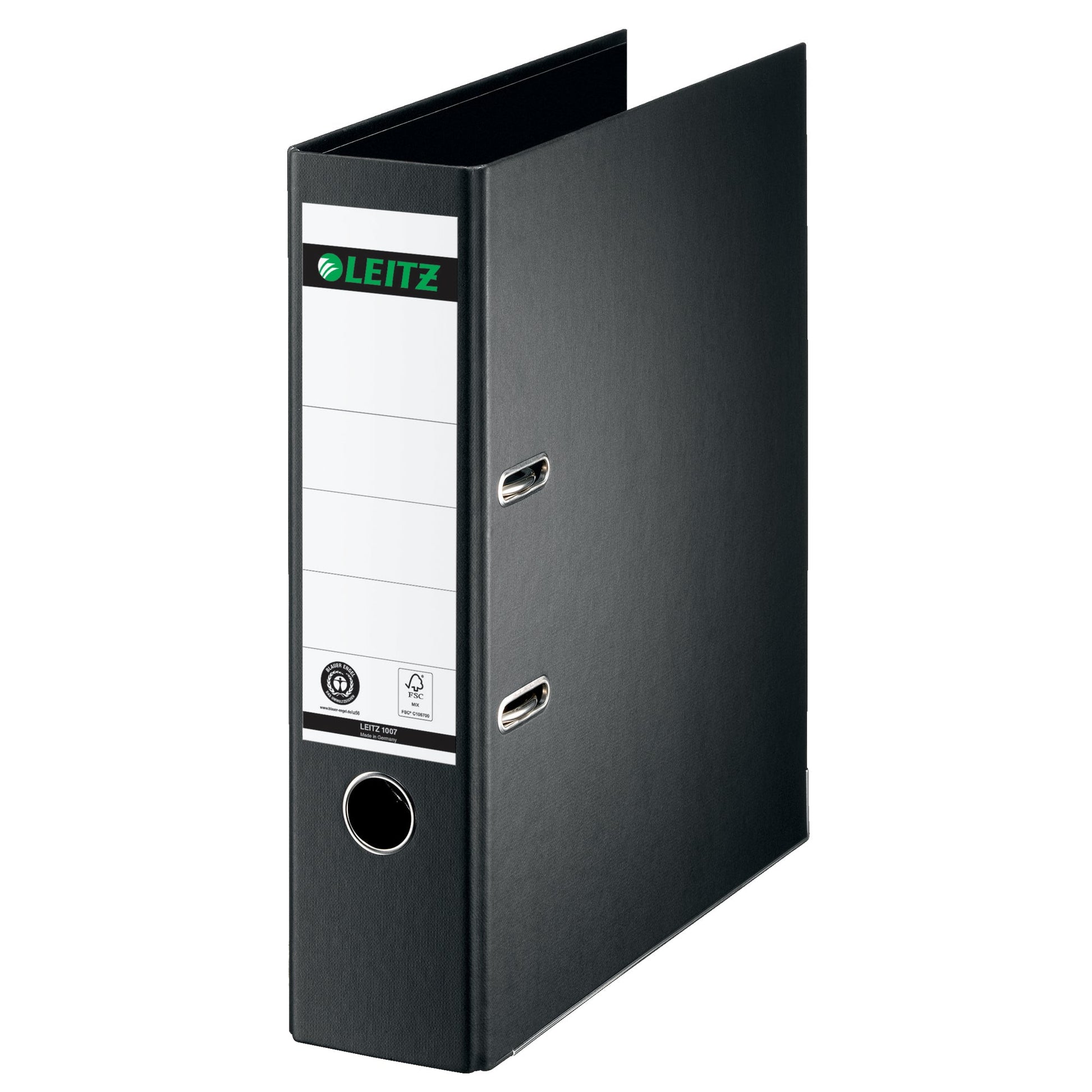 Bezeichnung: Leitz Ordner 80mm DIN A4 Rückenschild: geklebt mit Schlitzen Werkstoff: Pappe Material außen: Papier Material innen: Papier schwarz