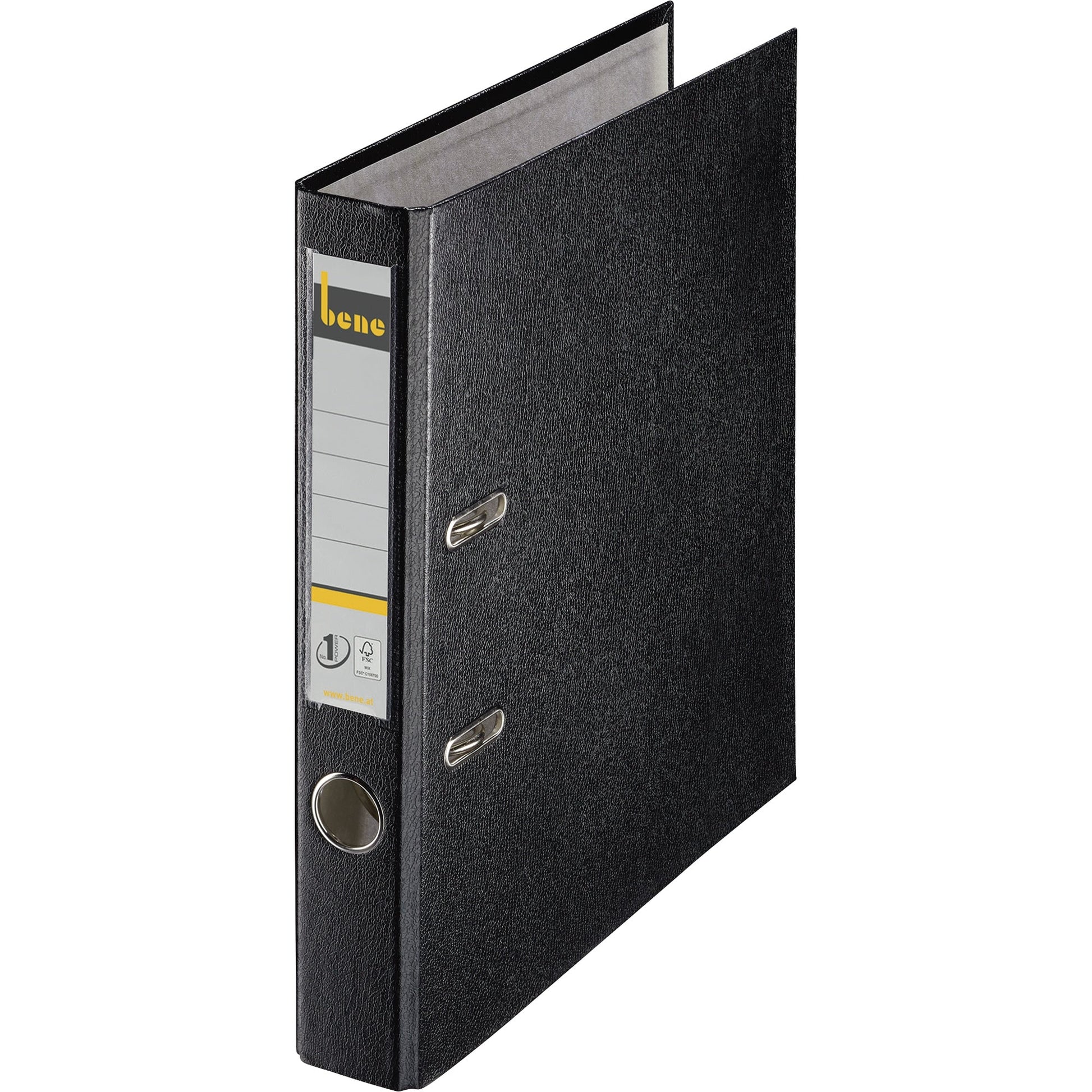 Bezeichnung: Bene Ordner 52mm DIN A4 Rückenschild: einsteckbar mit Schlitzen Werkstoff: Graupappe, recycelt Material außen: Polypropylen Material innen: Papier, recycelt schwarz