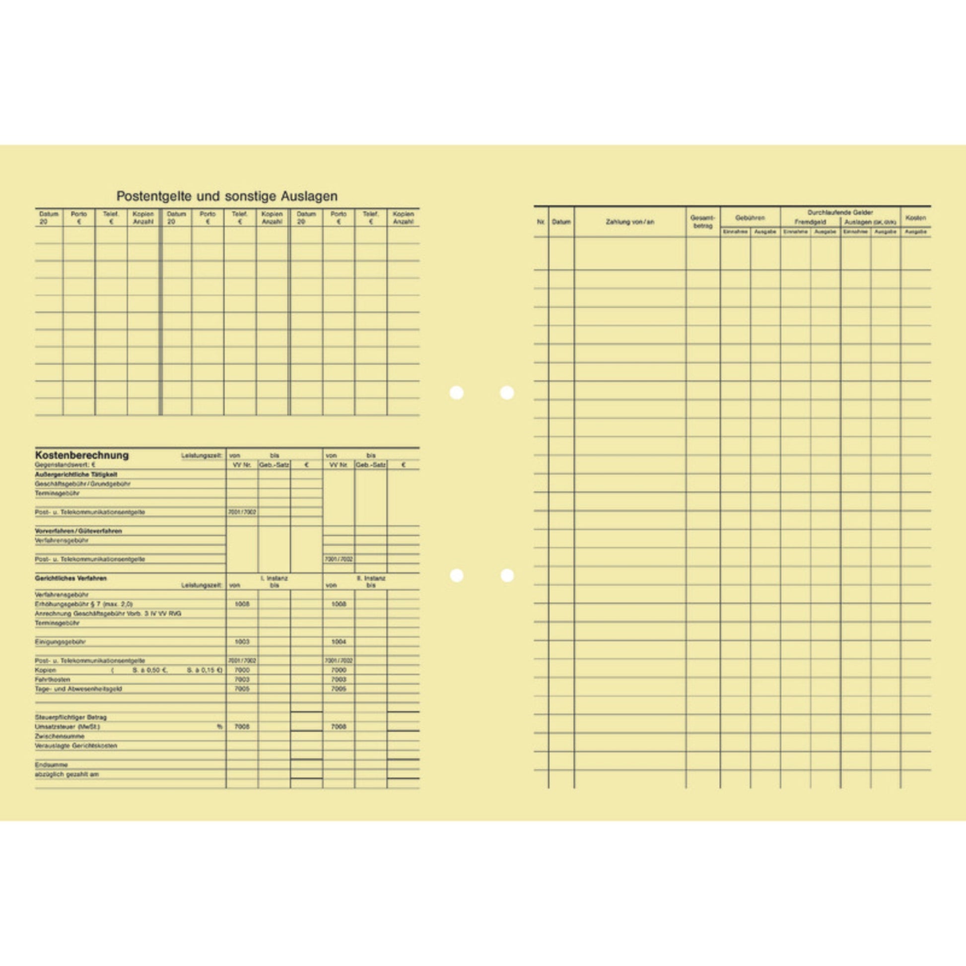 chamoisZur Aufnahme der Auslagen, Kostenberechnung und Buchhaltungsinformationen. Alle wichtigen Informationen auf einen Blick. 1. Seite: Informationen zur Akte. 2. Seite: Auslagen und Kostenberechnung nach RVG. 3. Seite: Buchhaltungsdaten. 4. Seite: frei. Alle Bögen sind gefalzt.