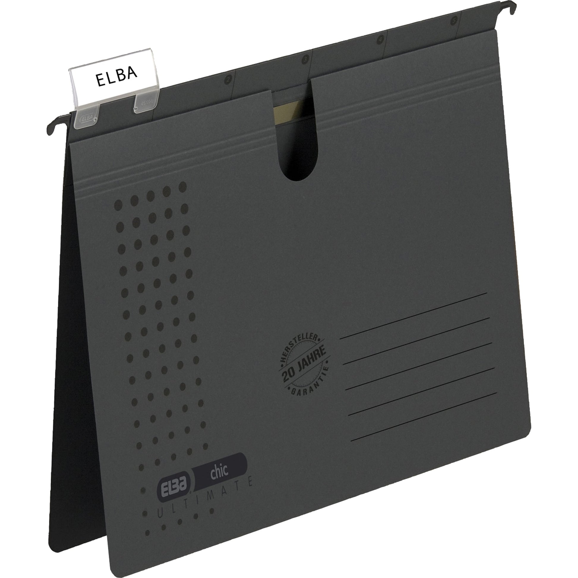 anthrazitExklusiver starker Karton verhindert das Ausreißen bei intensivem Gebrauch. Mit Daumenausschnitt, Schnellhefter-Mechanik auf dem Falz. Komfort-Sichtreiter mit aufklappbarer Rückwand und auswechselbarem Beschriftungsschildchen. Extrem steife Metallhängeschiene mit pulverbeschichteten Enden. Beschriftungsmöglichkeit mit ELBA print.