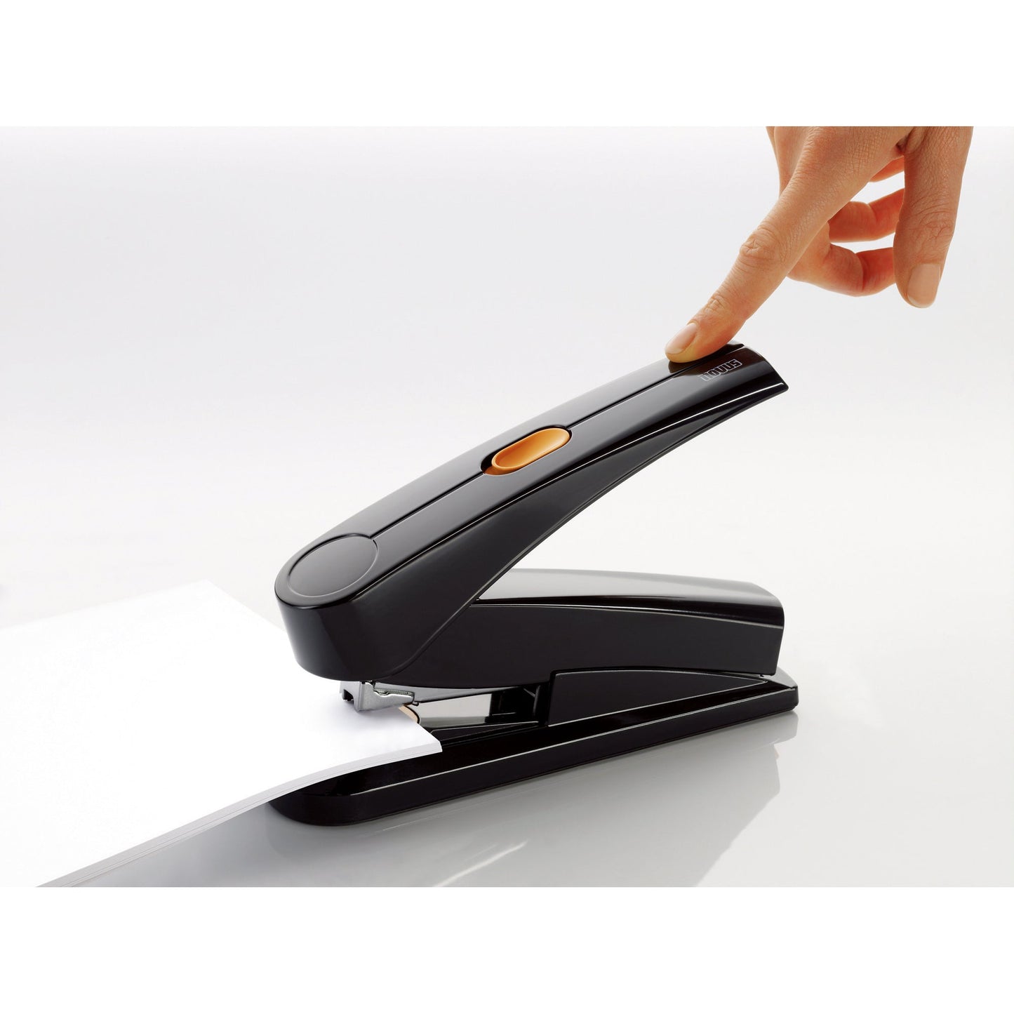 schwarzDas innovative Heftgerät mit Power-on-Demand-Funktion. Durch den aufklappbaren Hebel wird bei Bedarf eine enorme Kraftübersetzung erzielt. Für kleinere Papiermengen wird das Heftgerät wie herkömmlich genutzt. FlatClinch Bypass-Heftung (Klammern werden diagonal entgegen der Längsachse umgelegt): 2 - 50 Blatt werden mit nur einer Klammer (24/8 SUPER) geheftet. Ein Austausch der Klammern ist nicht mehr notwendig. 25 Jahre Garantie bei Verwendung von Novus Heftklammern.