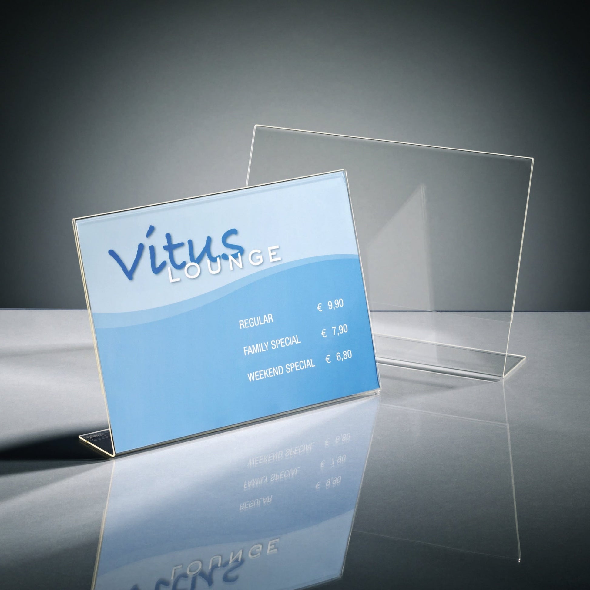 glasklarDie Sigel Tischaufsteller sind ein attraktiver Blickfang an Theken, Tischen, Ausstellungsräumen und Messen. Das hochwertige Acryl verleiht den Produkten eine sehr hohe Stabilität und Standfestigkeit. Tischaufsteller schräg für die einseitige Präsentation. 25 Jahre Garantie auf die UV-Beständigkeit des Acryls.
