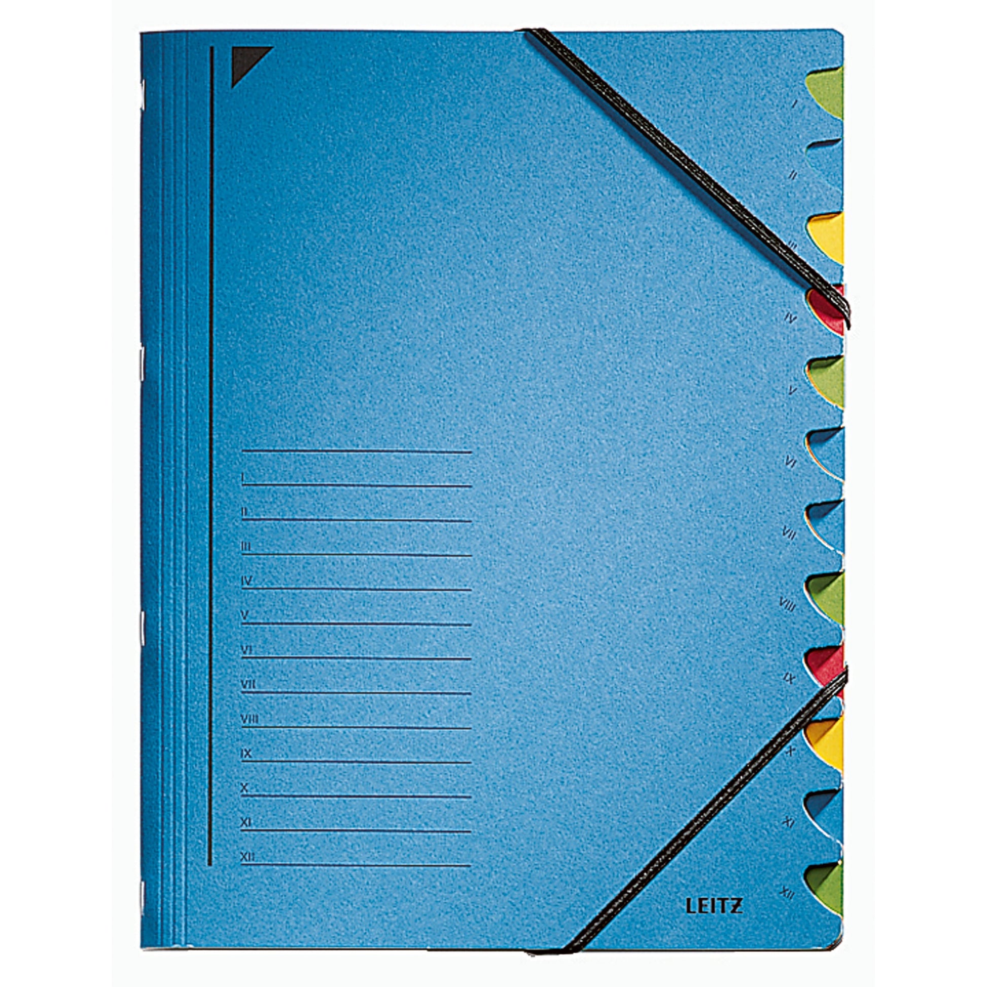 Bezeichnung: Leitz Ordnungsmappe DIN A4 350g/m² Pendareckarton, recycelt Farbe: blau Farbe des Fächerblocks: mehrfarbig 12 Fächer