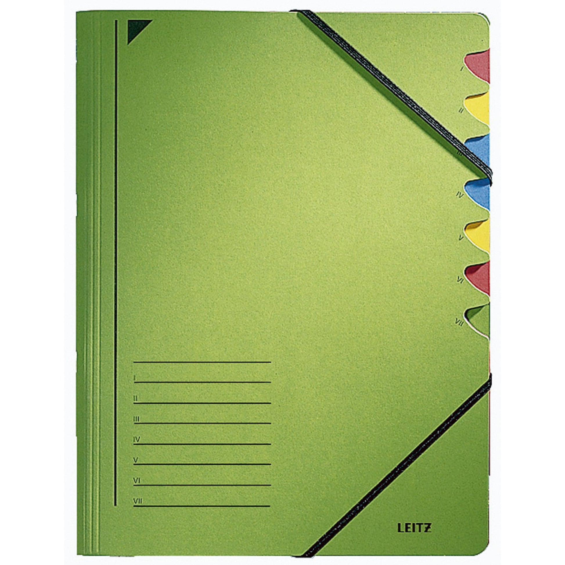 Bezeichnung: Leitz Ordnungsmappe DIN A4 350g/m² Pendareckarton, recycelt Farbe: grün Farbe des Fächerblocks: mehrfarbig 7 Fächer