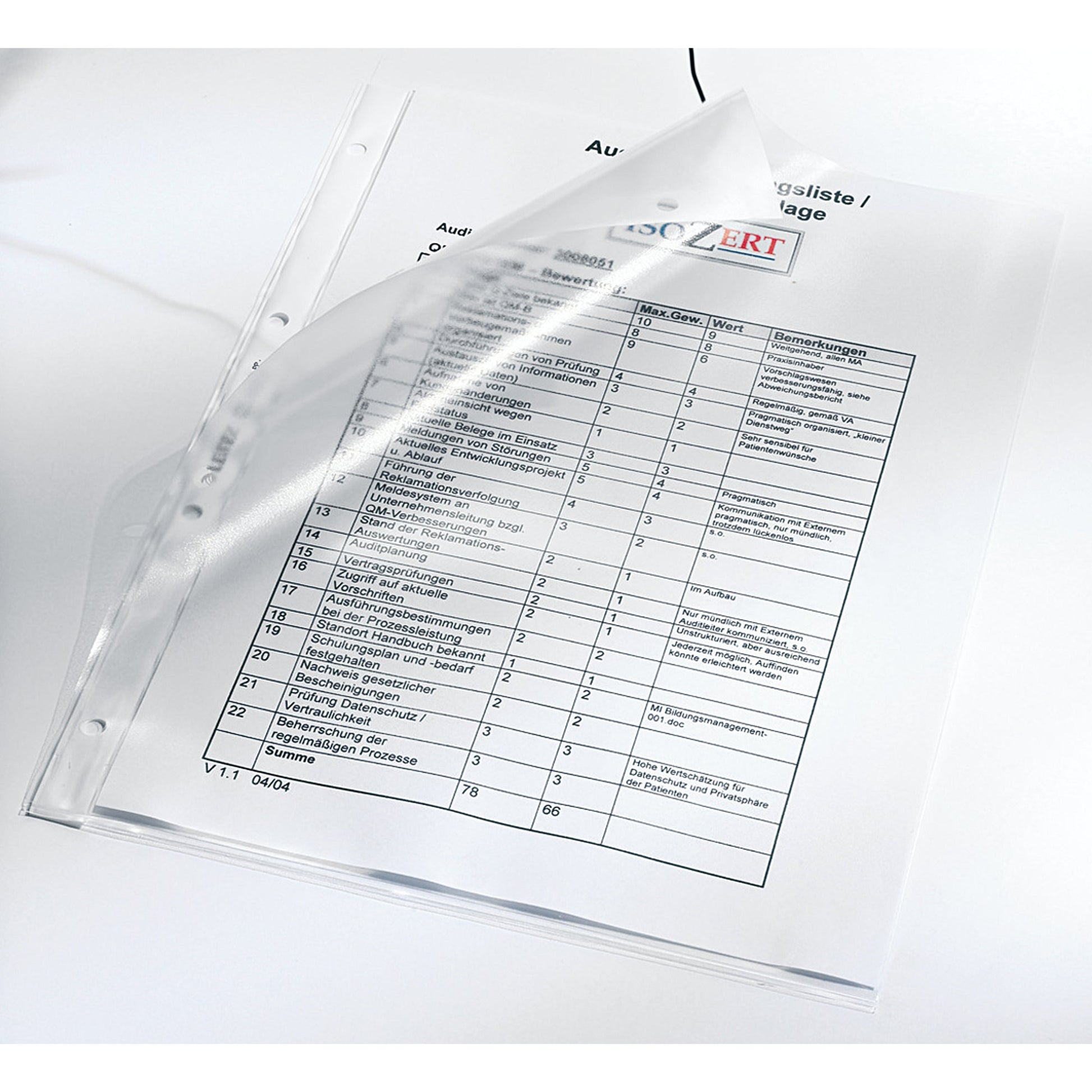 Bezeichnung: Leitz Prospekthülle Premium durchgehend gelochtes Oberteil DIN A4 130µm oben, links offen Polypropylen, 30 % recycelt farblos 100 St./Pack.