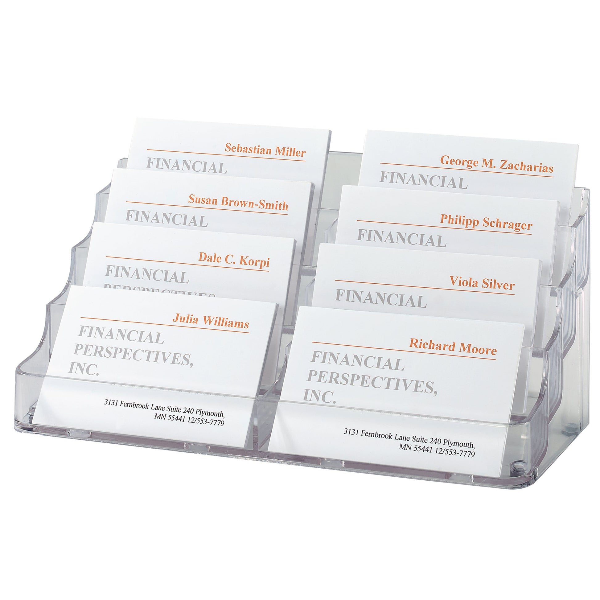 glasklarZur besonders platzsparenden Präsentation und schnellen Entnahme von verschiedenen Visitenkarten. Dank transparenter Gummifüße standfest und rutschsicher.