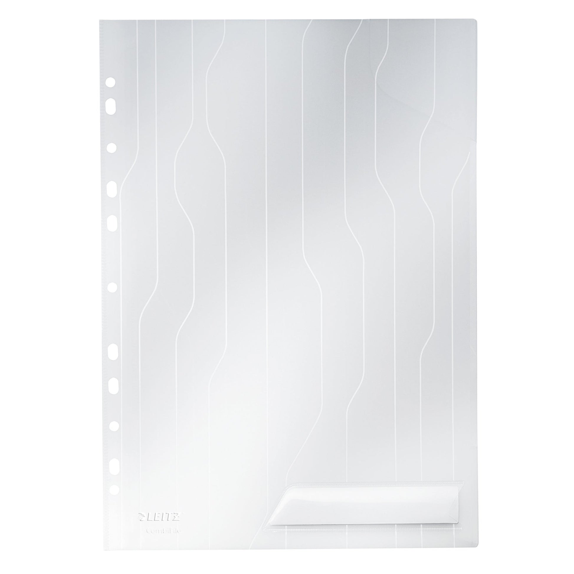 transparentHülle CombiFile - eine Kombination aus Sicht- und Prospekthülle. Mit einklappbarem Lochrand, mit Verschlußlasche rechts oben und Beschriftungsstreifen.