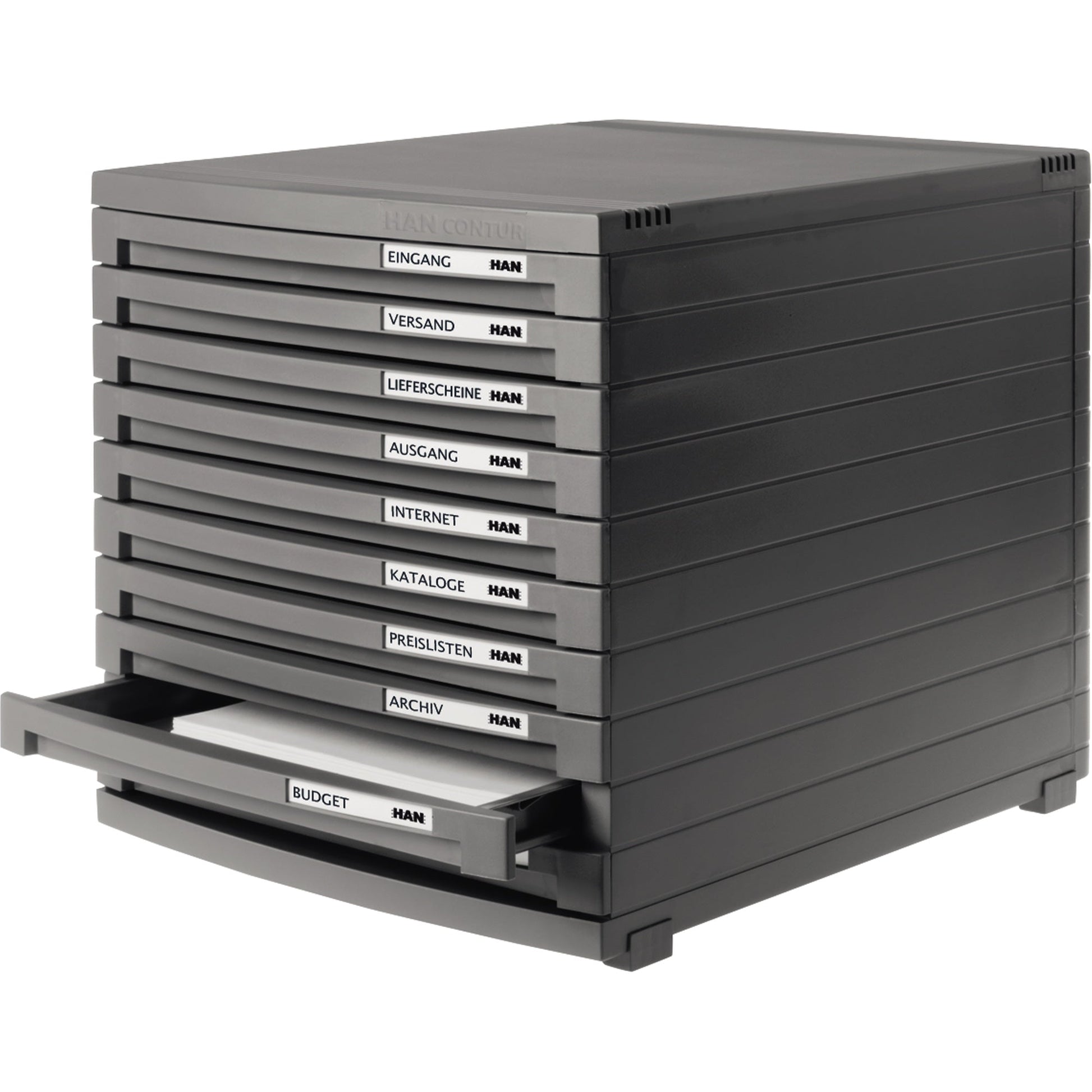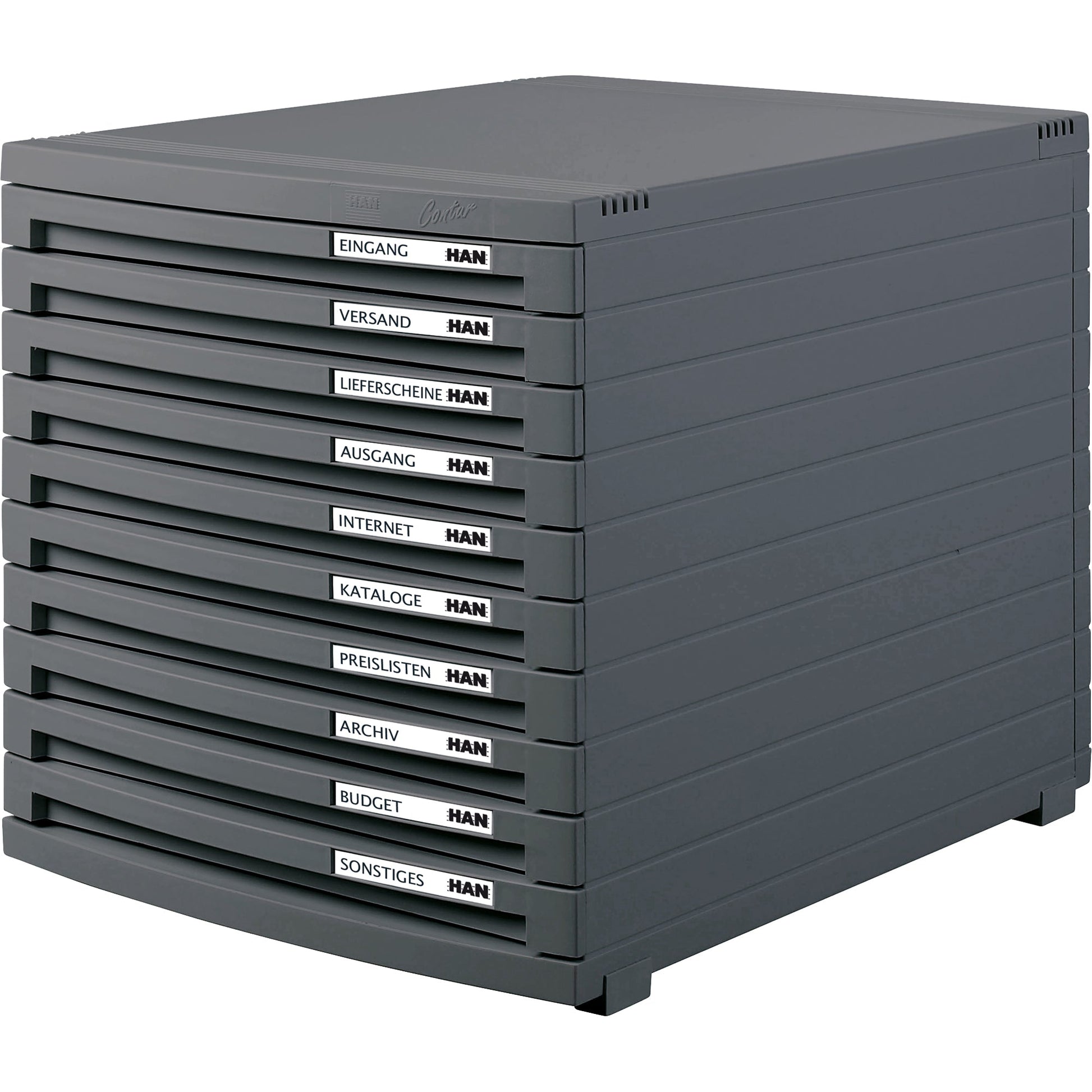 Bezeichnung: HAN Schubladenbox CONTUR 10 Schubladen DIN A4, DIN B4, DIN C4 Polystyrol Gehäusefarbe: dunkelgrau Farbe der Schublade: dunkelgrau
