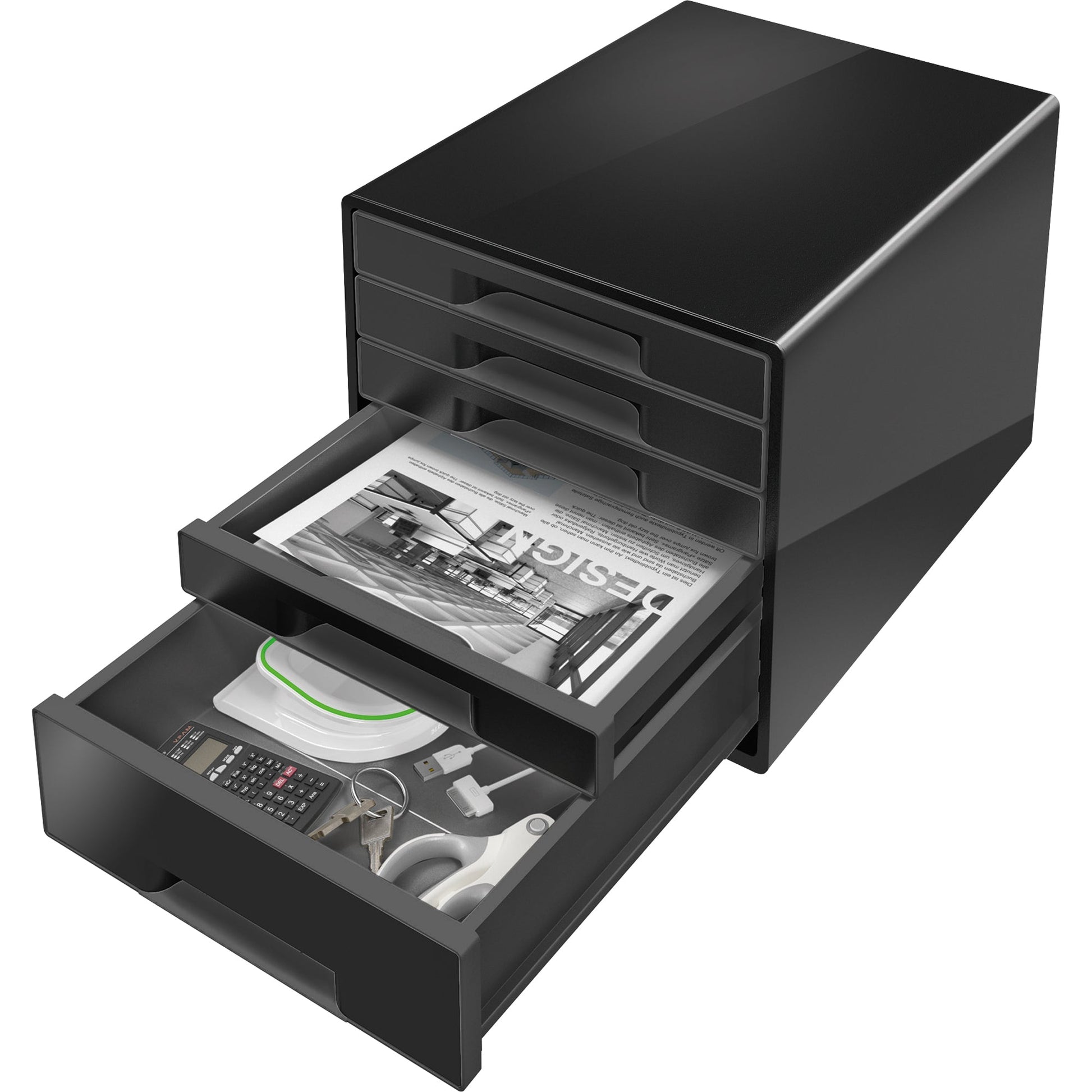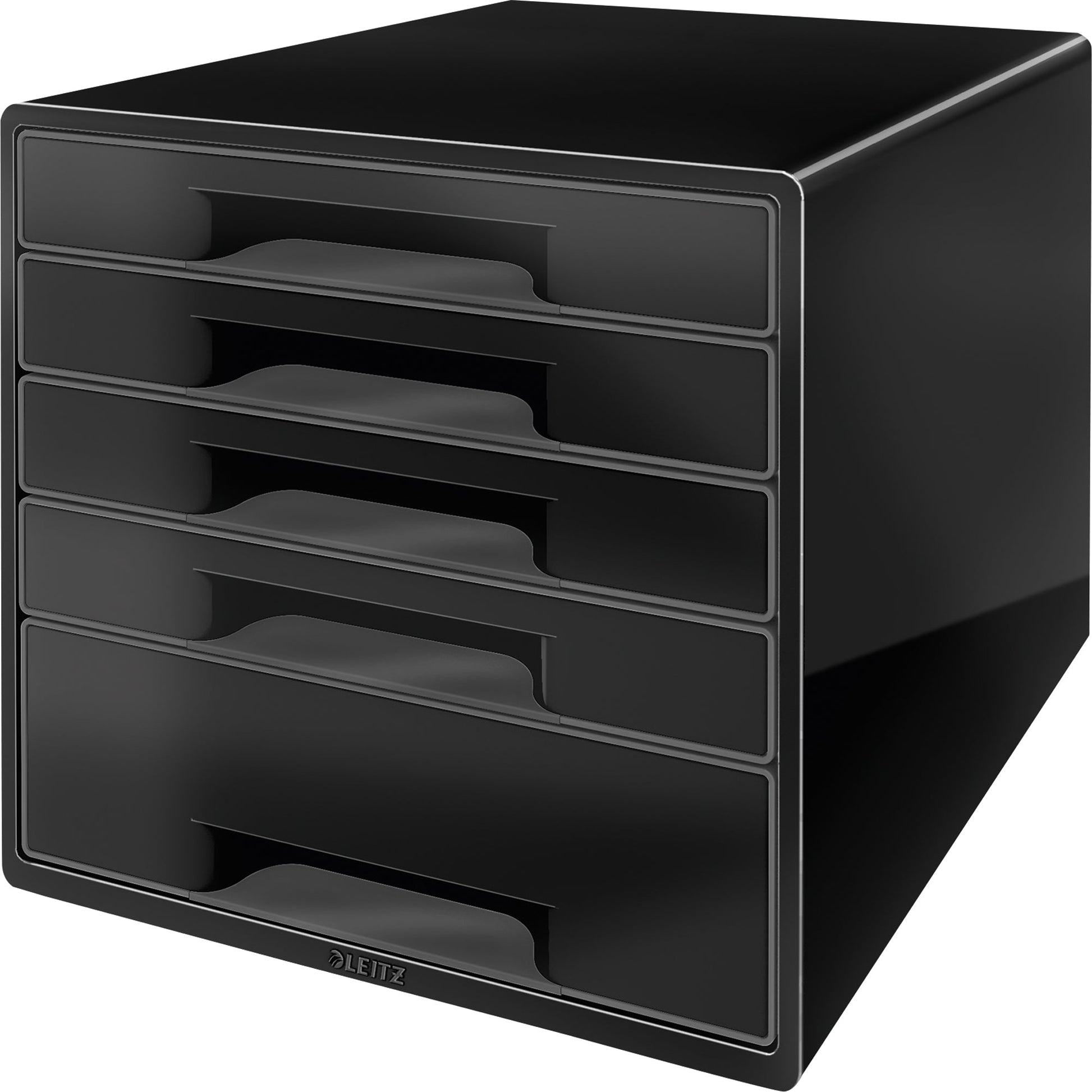Bezeichnung: Leitz Schubladenbox CUBE 5 Schubladen DIN A4 Polystyrol Gehäusefarbe: schwarz Farbe der Schublade: schwarz