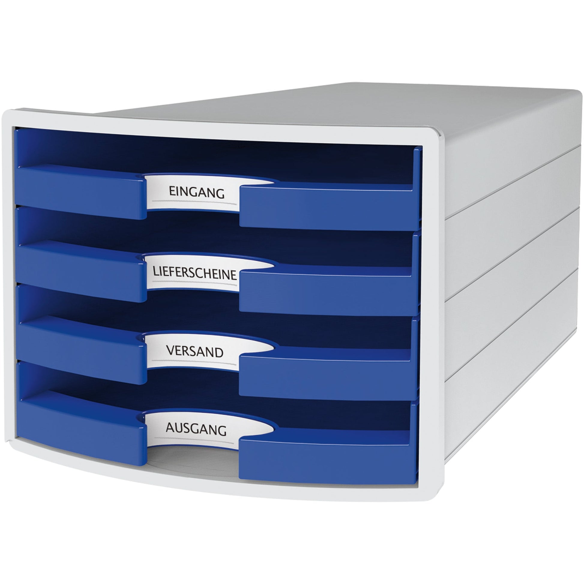 Bezeichnung: HAN Schubladenbox IMPULS 4 Schubladen DIN A4, DIN C4 Polystyrol Gehäusefarbe: lichtgrau Farbe der Schublade: blau