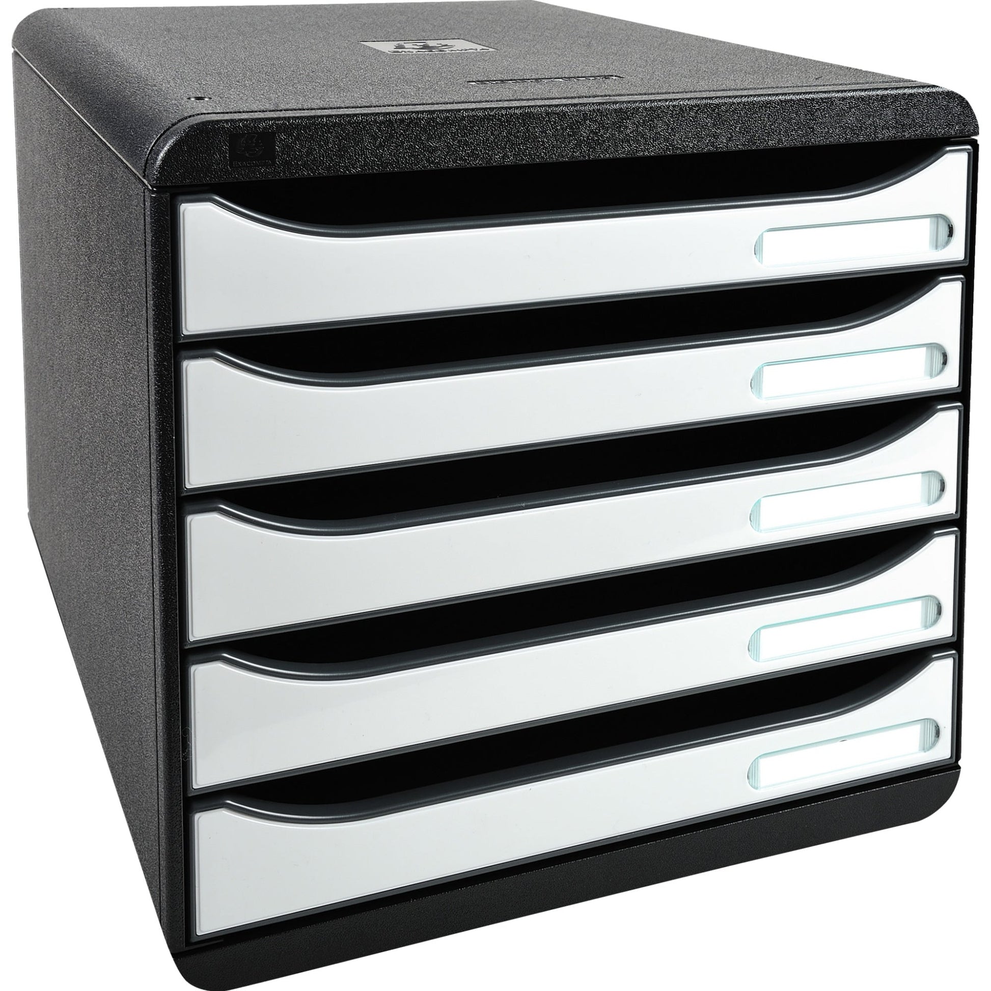 Bezeichnung: Exacompta Schubladenbox BIG-BOX plus 5 Schubladen DIN A4, Überbreite Polystyrol Gehäusefarbe: schwarz Farbe der Schublade: weiß glossy