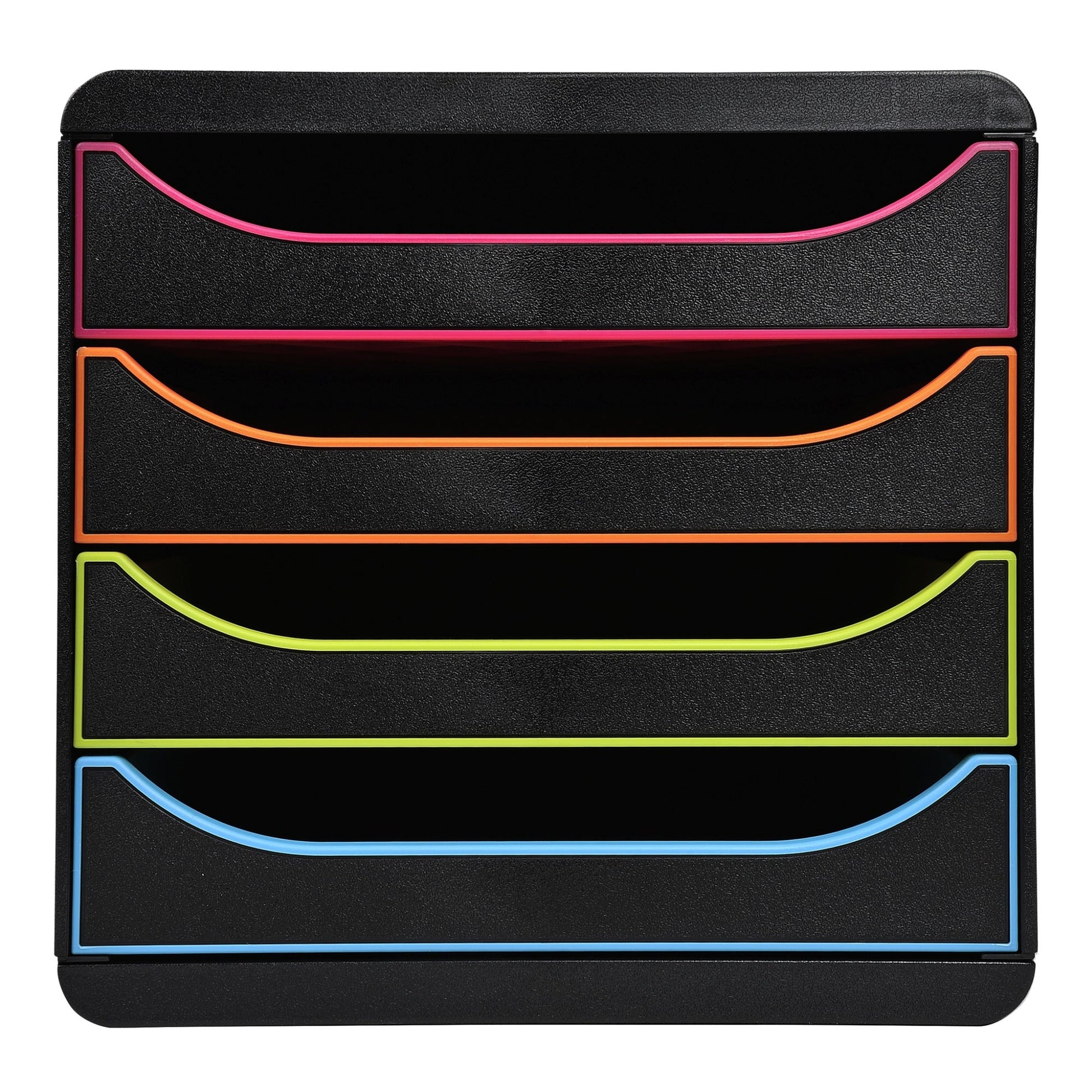 Bezeichnung: Exacompta Schubladenbox BIG-BOX 4 Schubladen DIN A4, Überbreite Polystyrol Gehäusefarbe: schwarz Farbe der Schublade: schwarz/harlekin