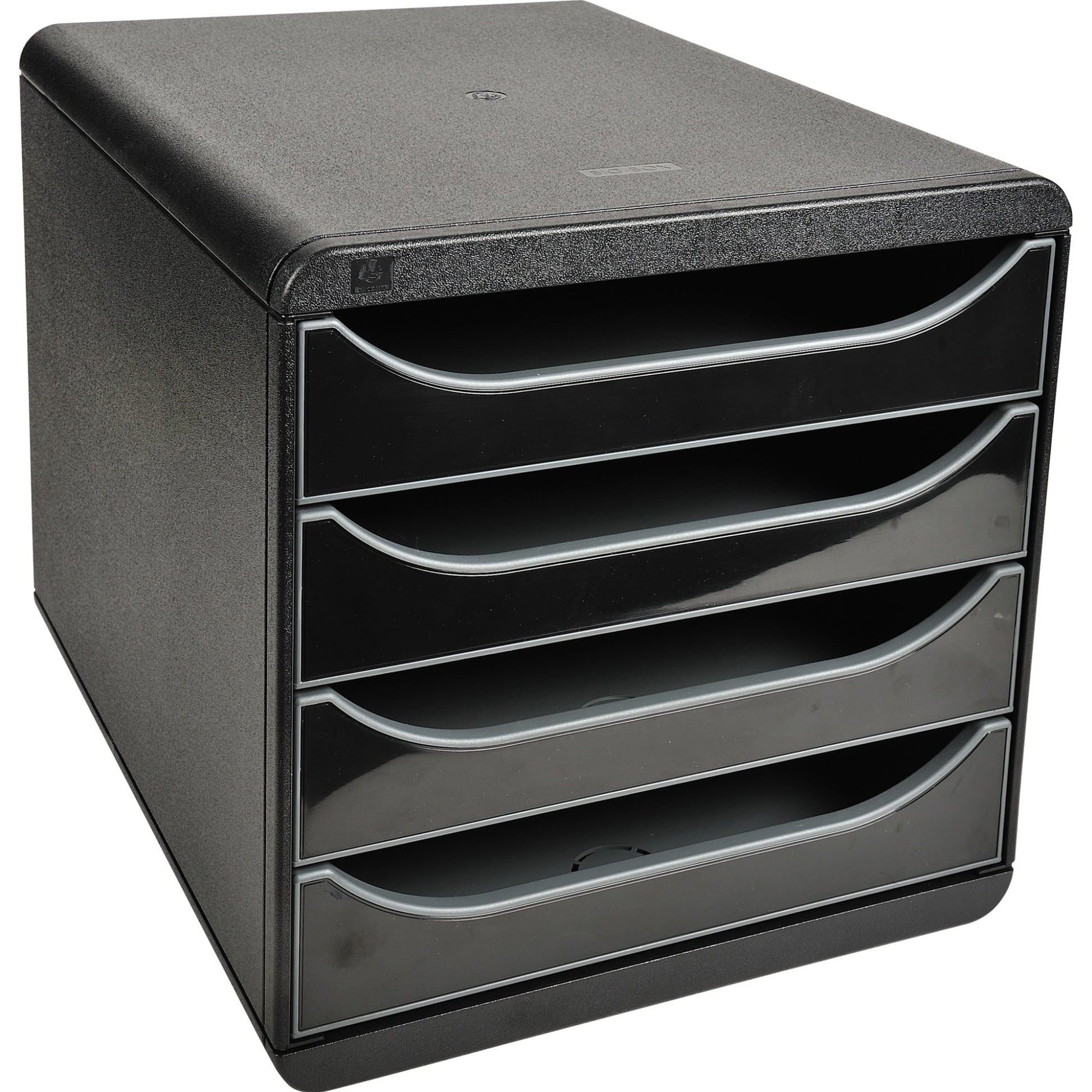 Bezeichnung: Exacompta Schubladenbox BIG-BOX 4 Schubladen DIN A4, Überbreite Polystyrol Gehäusefarbe: schwarz Farbe der Schublade: schwarz glossy