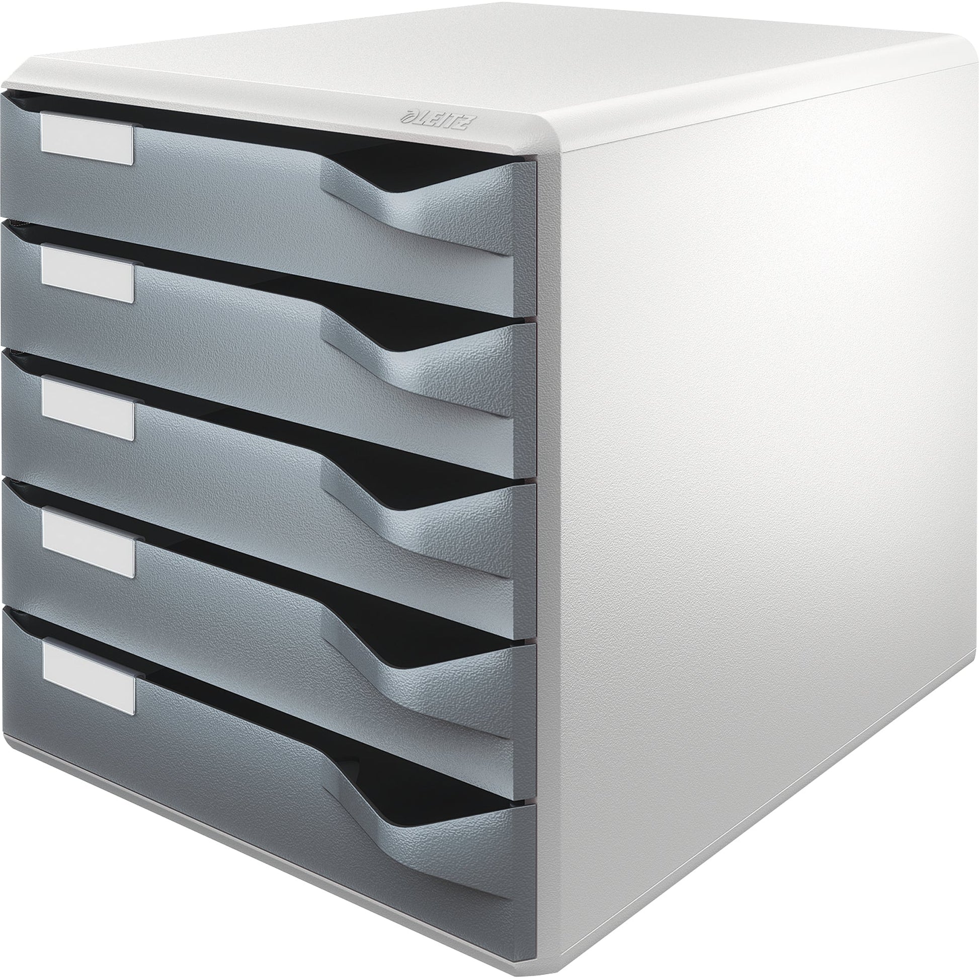 Bezeichnung: Leitz Schubladenbox 5 Schubladen DIN A4, Überbreite Polystyrol Gehäusefarbe: lichtgrau Farbe der Schublade: dunkelgrau