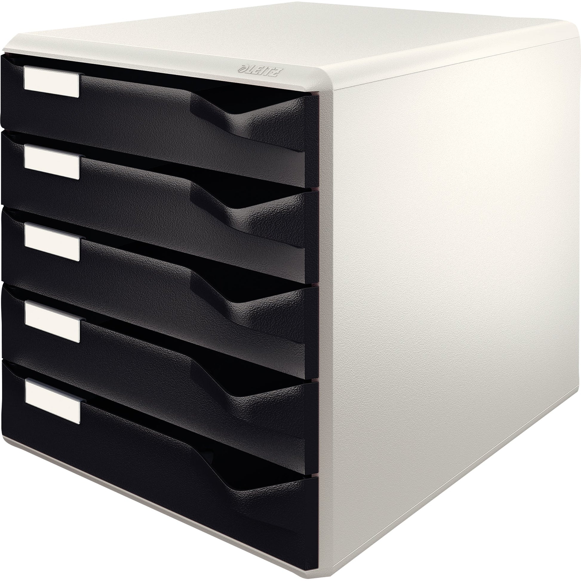 Bezeichnung: Leitz Schubladenbox 5 Schubladen DIN A4, Überbreite Polystyrol Gehäusefarbe: lichtgrau Farbe der Schublade: schwarz