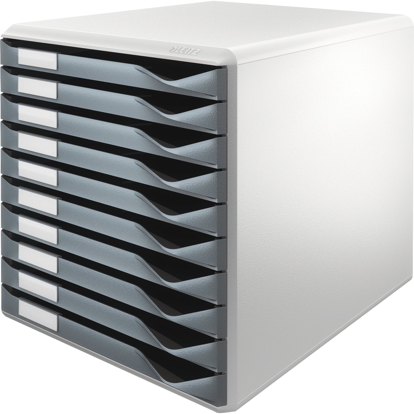 Bezeichnung: Leitz Schubladenbox 10 Schubladen DIN A4, Überbreite Polystyrol Gehäusefarbe: lichtgrau Farbe der Schublade: dunkelgrau