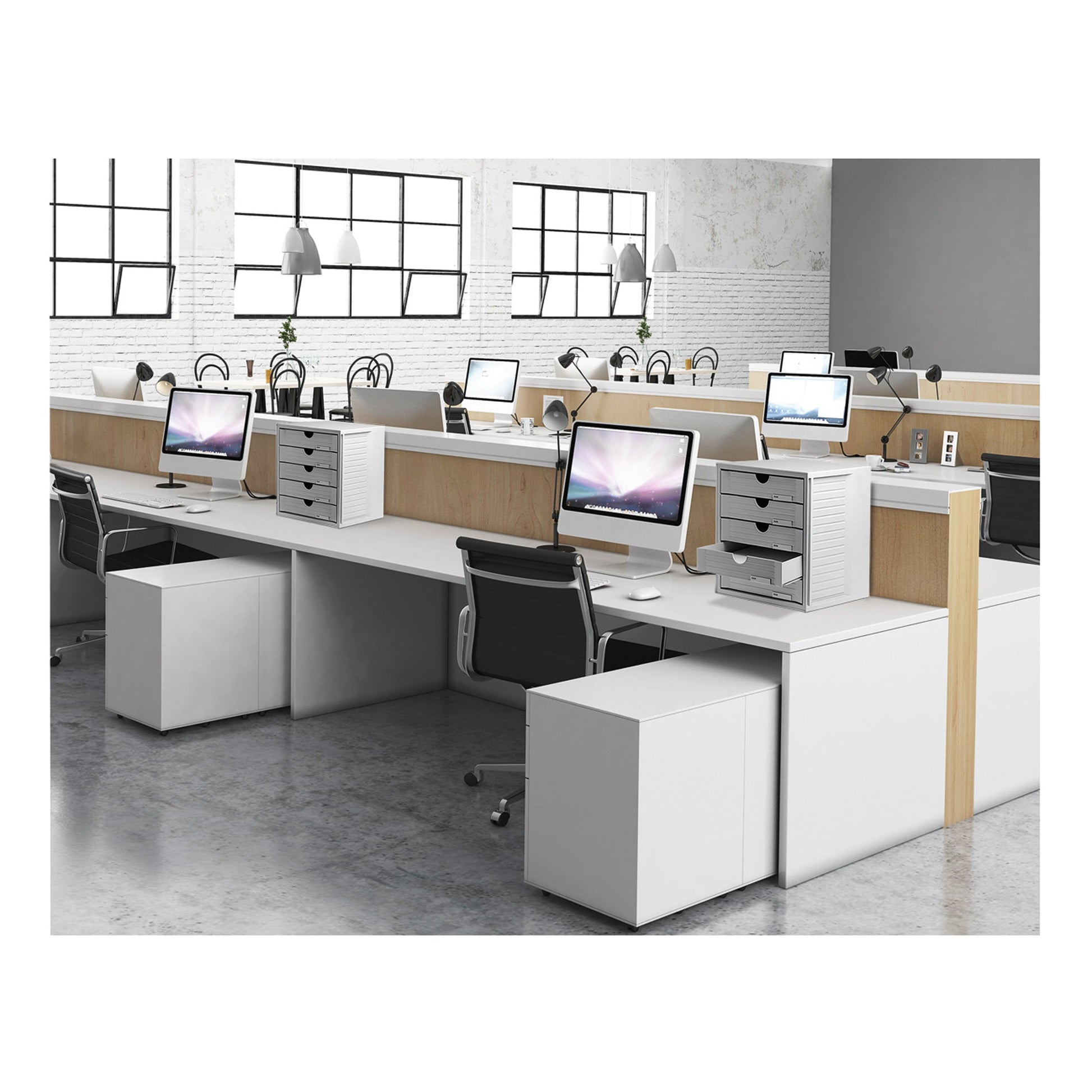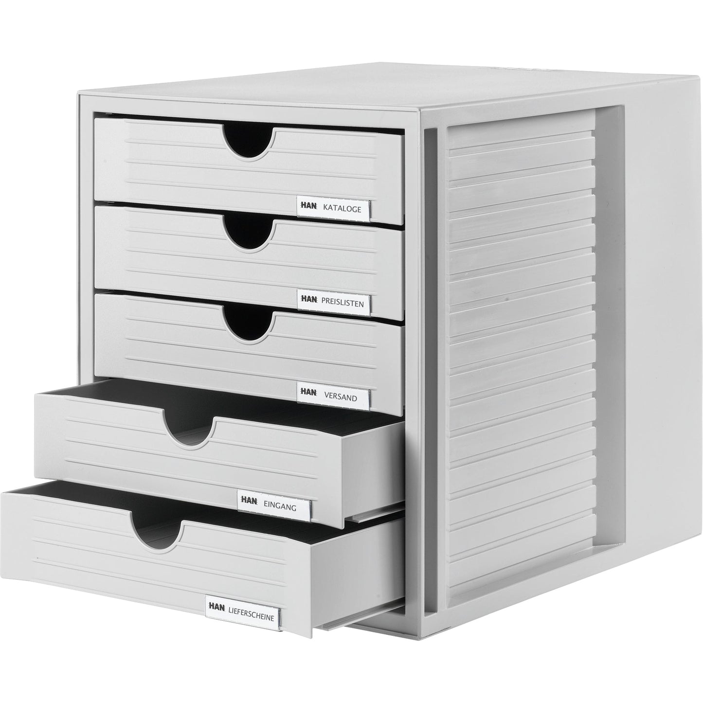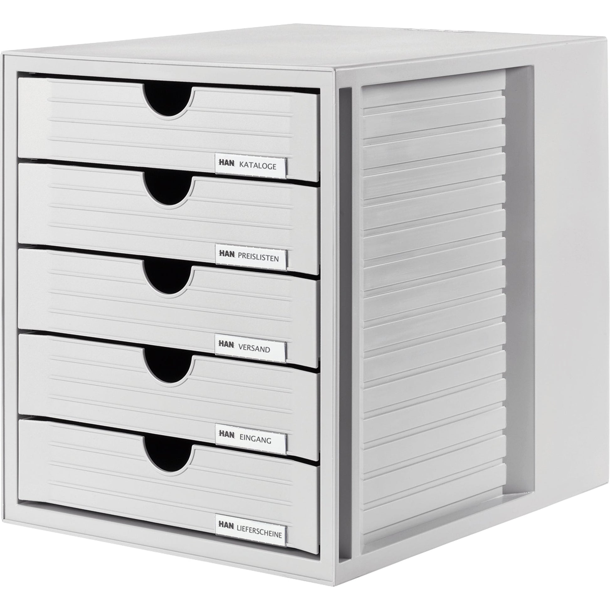 Bezeichnung: HAN Schubladenbox SYSTEMBOX 5 Schubladen DIN C4 Polystyrol Gehäusefarbe: lichtgrau Farbe der Schublade: lichtgrau