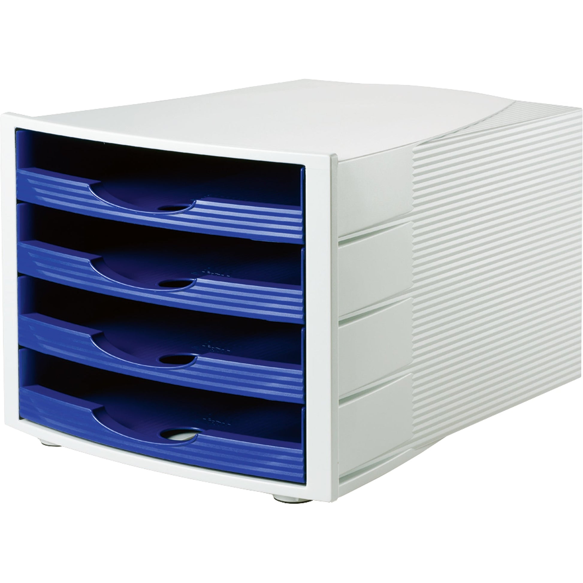 Bezeichnung: Soennecken Schubladenbox 4 Schubladen DIN A4 Polystyrol Gehäusefarbe: lichtgrau Farbe der Schublade: blau