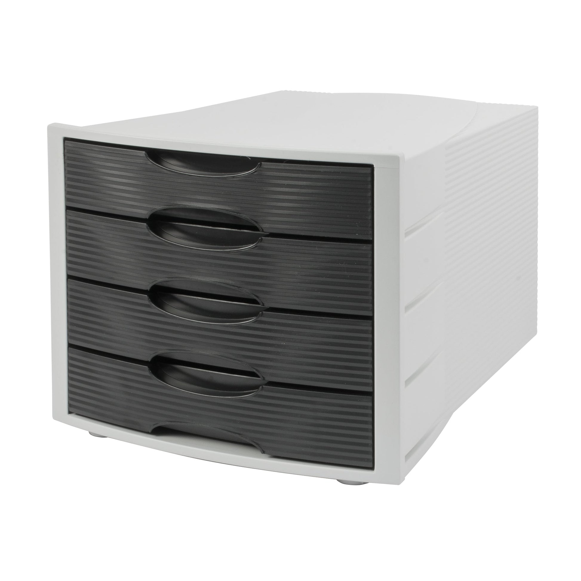 Bezeichnung: Soennecken Schubladenbox 4 Schubladen DIN A4 Polystyrol Gehäusefarbe: lichtgrau Farbe der Schublade: schwarz