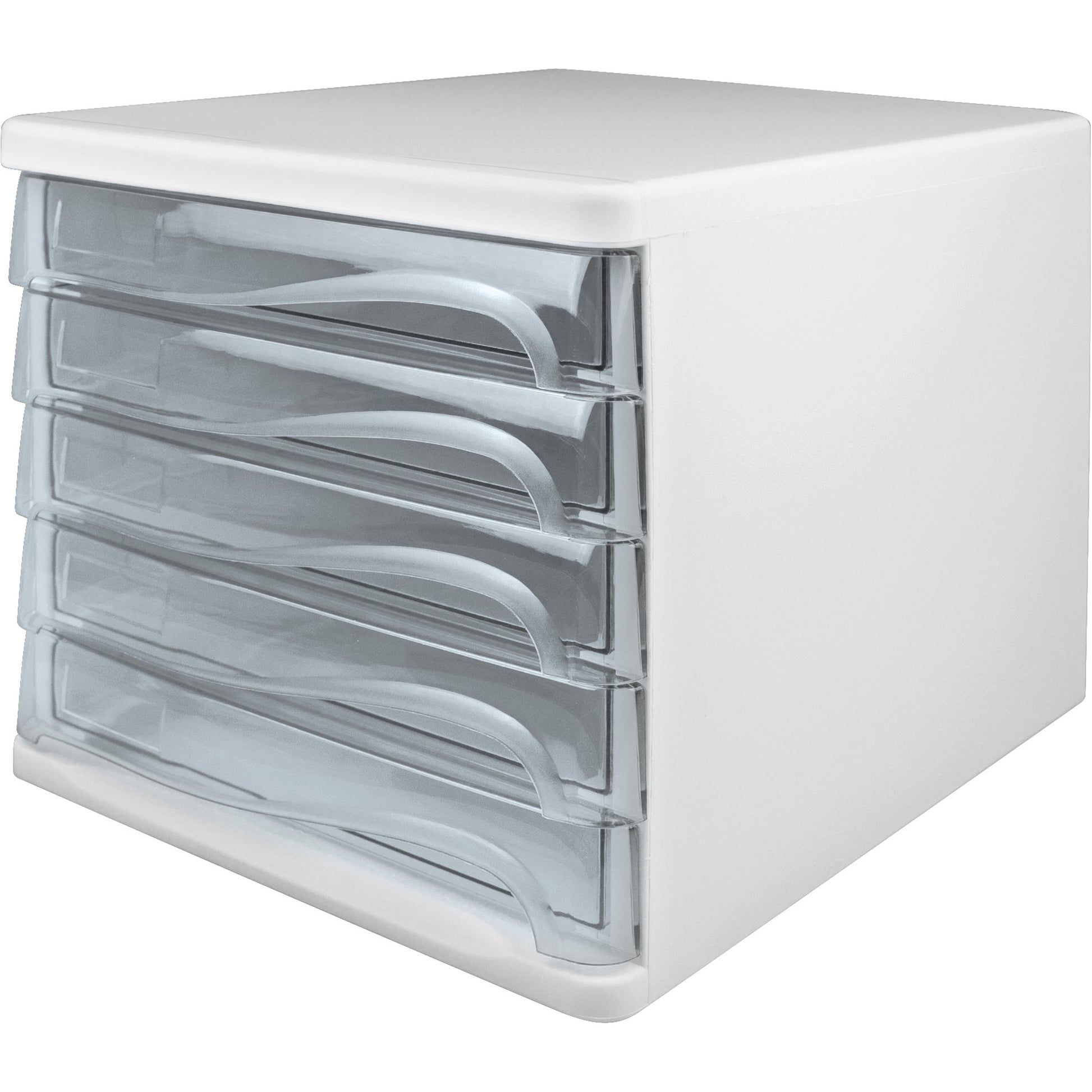 Bezeichnung: helit Schubladenbox the wave 5 Schubladen DIN A4, DIN C4 Polypropylen/Polystyrol Gehäusefarbe: weiß Farbe der Schublade: glasklar
