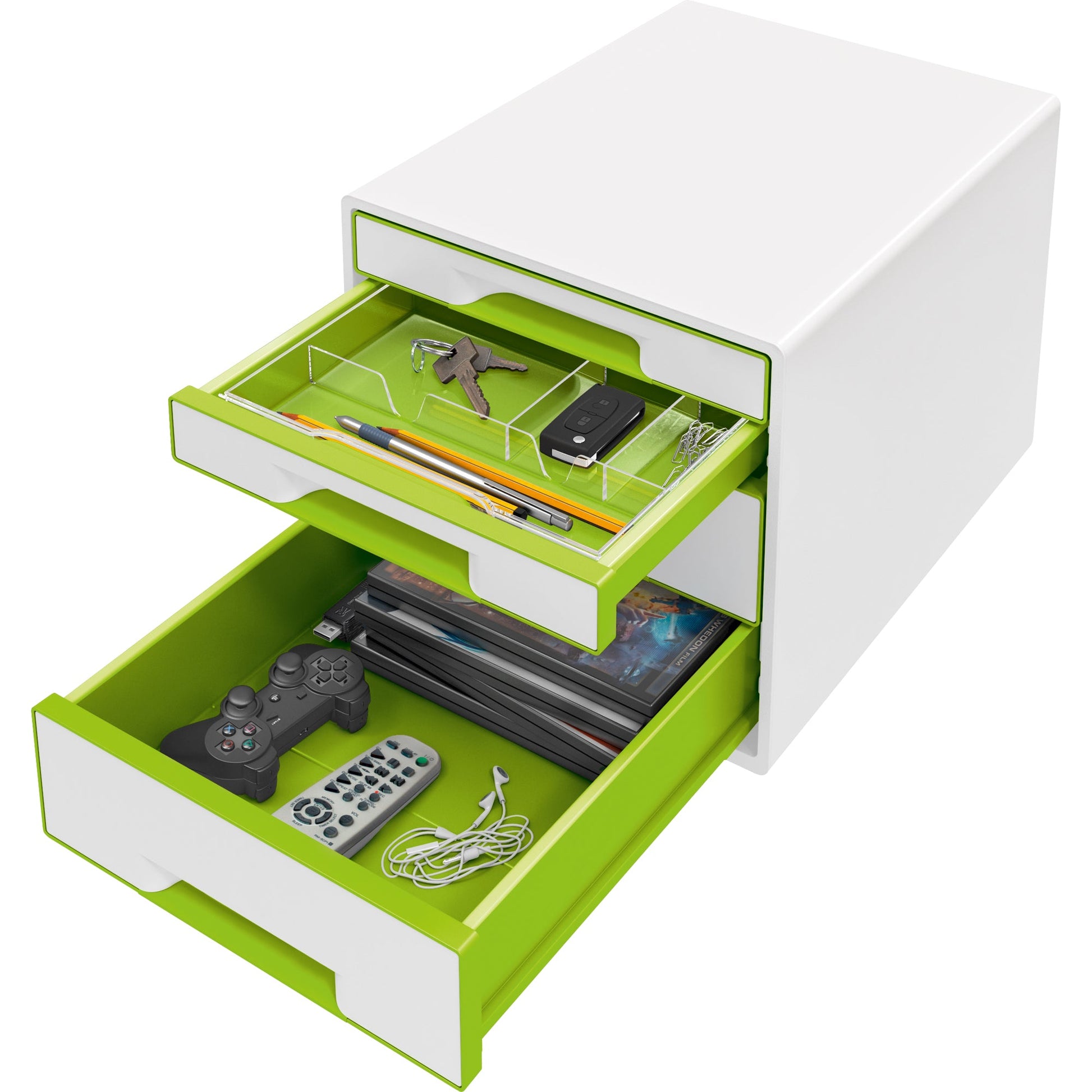 Bezeichnung: Leitz Schubladenbox WOW CUBE 4 Schubladen DIN A4 Polystyrol Gehäusefarbe: weiß Farbe der Schublade: grün/weiß