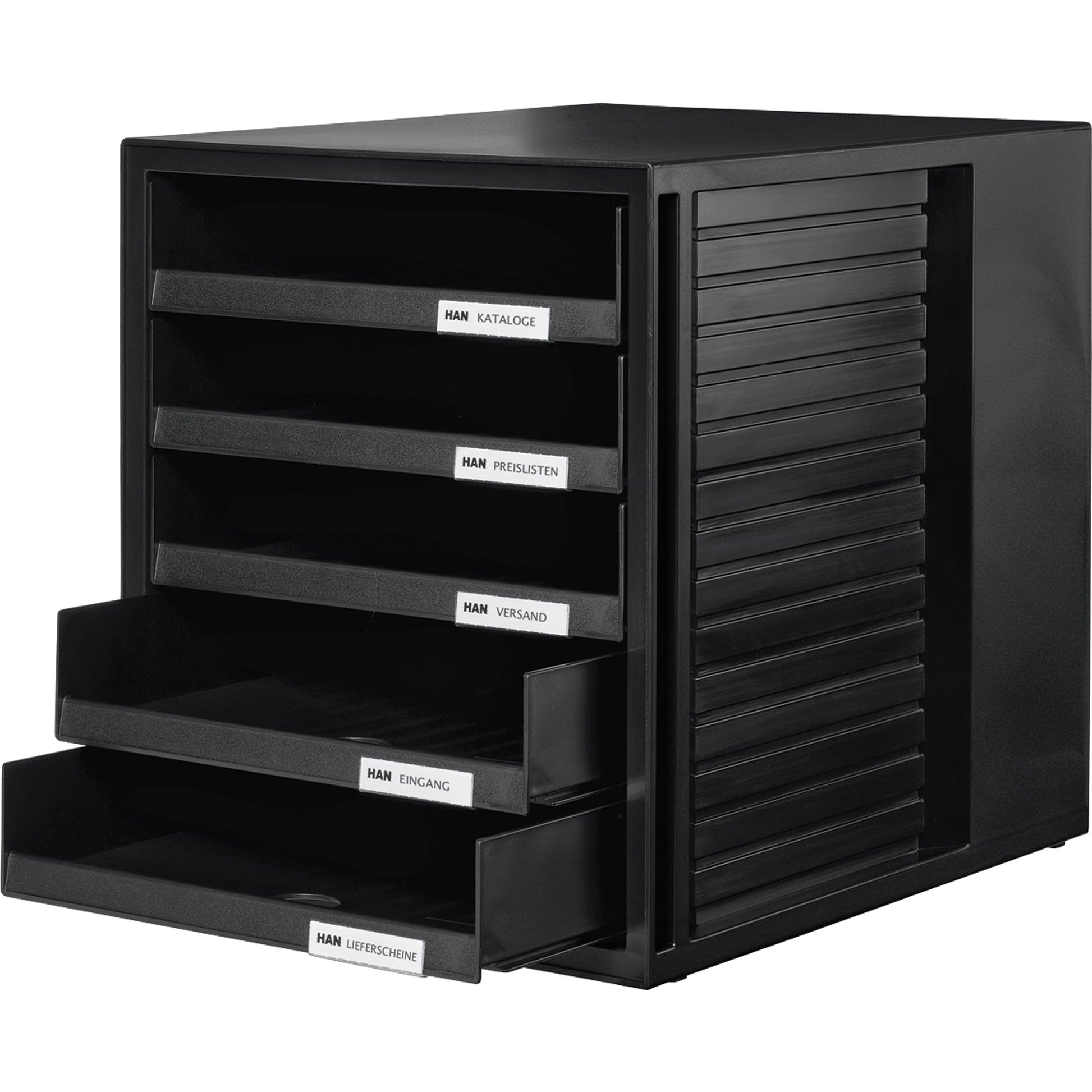 Bezeichnung: HAN Schubladenbox SCHRANK-SET 5 Schubladen DIN A4 Polystyrol Gehäusefarbe: schwarz Farbe der Schublade: schwarz