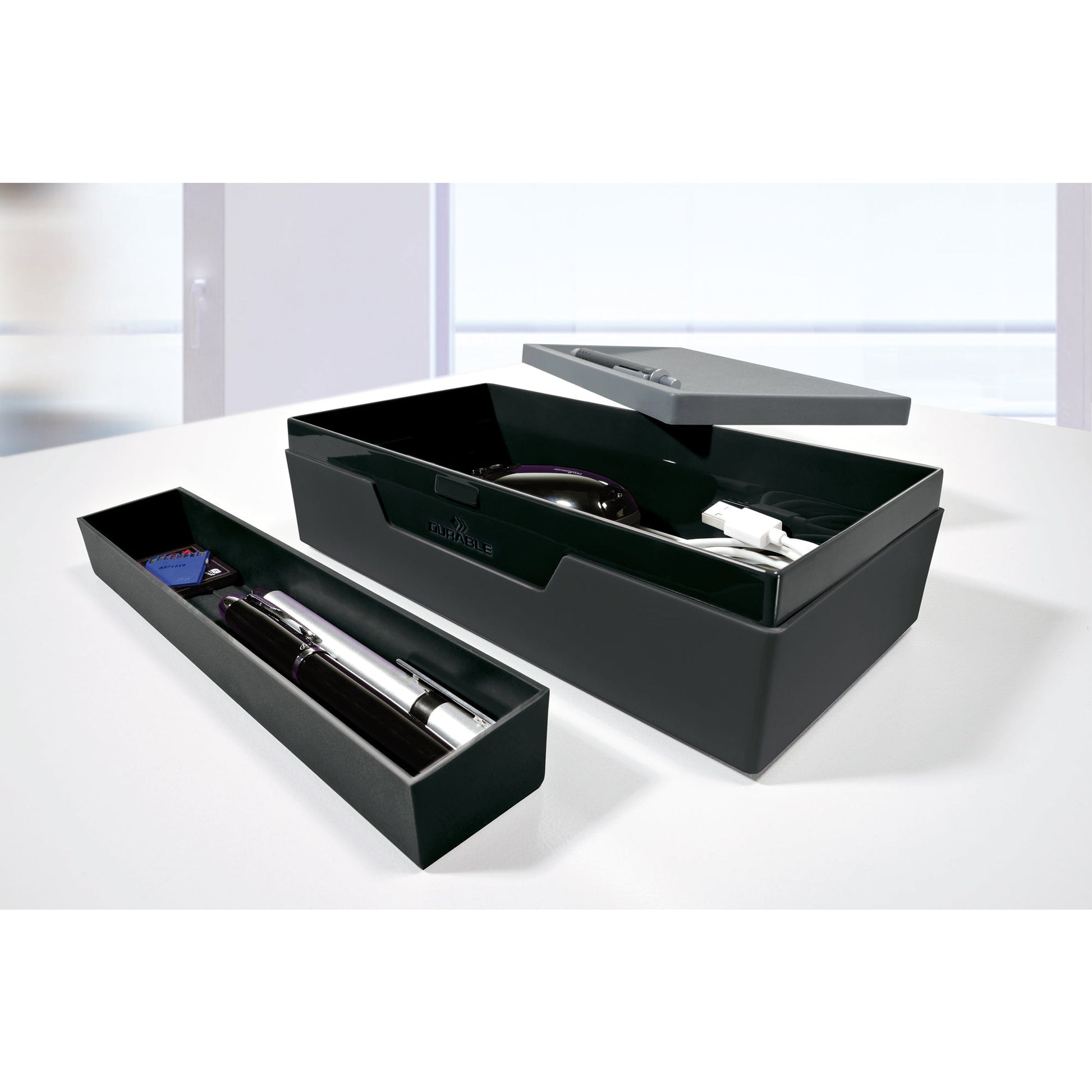anthrazitInnovative mobile Box mit schließendem Deckel für ein Höchstmaß an Flexibilität. Ergonomisch und funktional. Zur Nutzung am Arbeitsplatz und für den mobilen Transporteinsatz geeignet. Mit innenliegender Fächerschale. Zur Aufbewahrung von Kleinutensilien, wie Ladekabel für Tablet-PCs und Smartphones, Stecker, Laserpointer, Stifte, Post it, Textmarker, SD-Karten, etc..