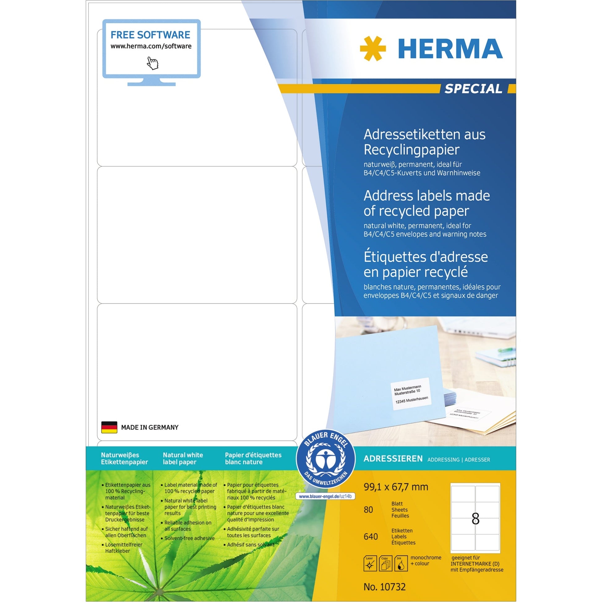 Bezeichnung: HERMA Universaletikett Recycling 99,1 x 67,7 mm (B x H) nicht wieder ablösbar Papier, 100 % recycelt naturweiß 640 Etik./Pack.