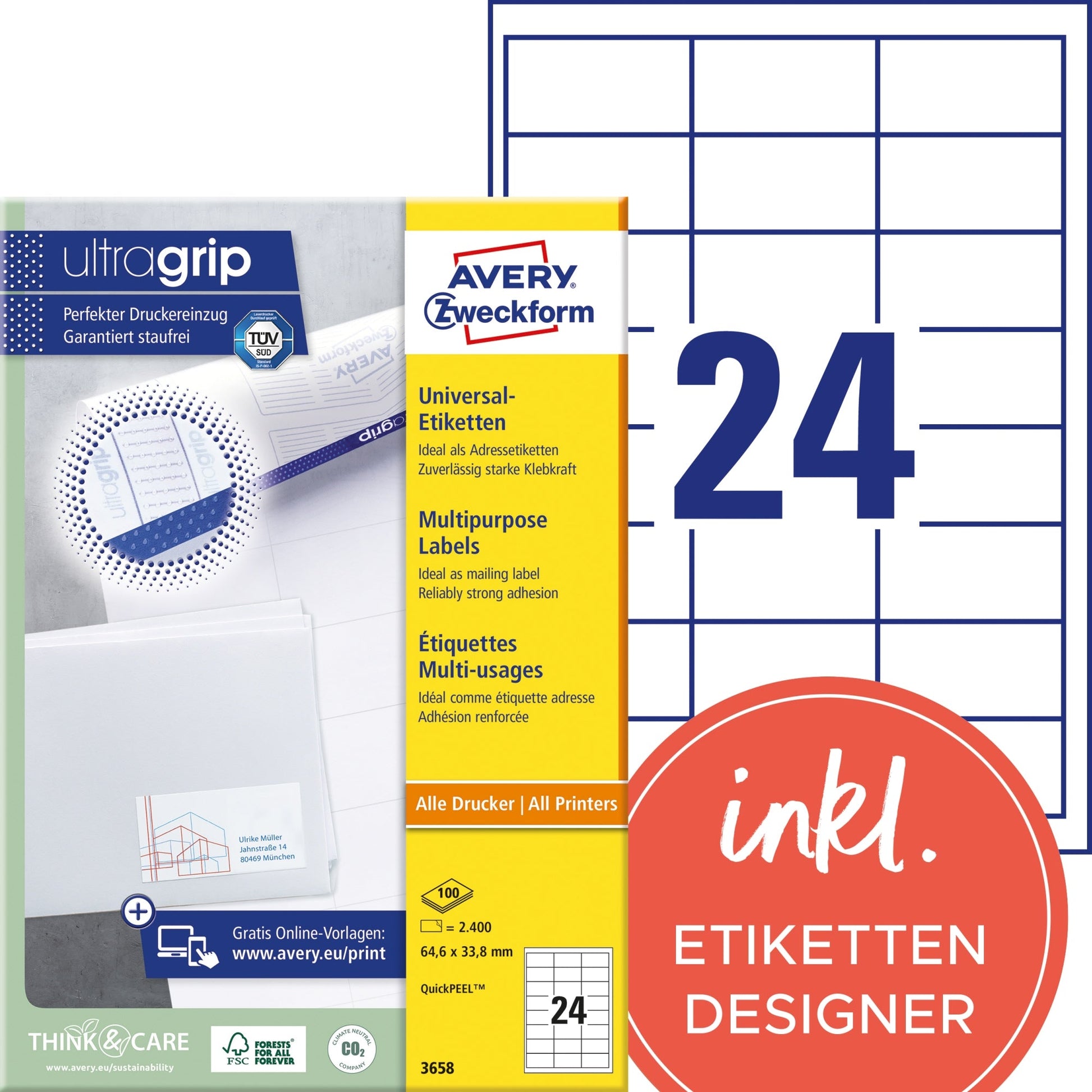 Bezeichnung: Avery Zweckform Universaletikett ultragrip 64,6 x 33,8 mm (B x H) nicht wieder ablösbar Papier weiß 2.400 Etik./Pack.