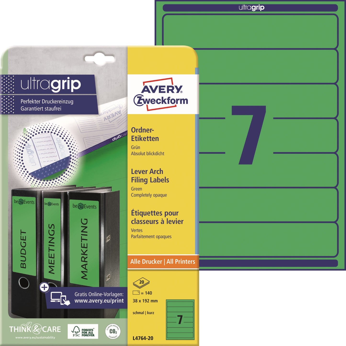 Bezeichnung: Avery Zweckform Ordnerrückenetikett ultragrip schmal/kurz 38 x 192 mm (B x H) selbstklebend ohne Griffloch grün 140 Etik./Pack.