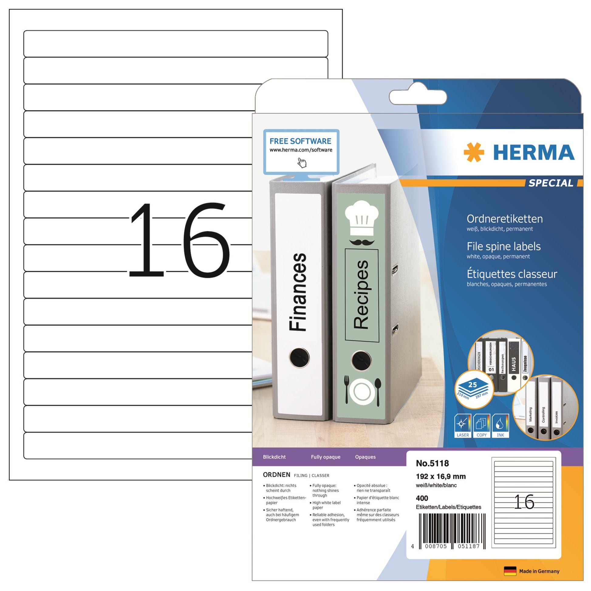 weißFür alle gängigen Ordner geeignet. Absolut blickdichtes Material mit hohem Weißgrad, alte Ordnerbeschriftungen scheinen nicht durch. Blanko: Ideal für Firmenlogo, Beschriftungen und Ordnungsvermerke. Sicher haftend, auch bei häufigem Ordnergebrauch. Etiketten sind 100 % recyclingfähig mit dem Altpapier, Verpackung aus Recyclingkarton. Kostenlose Softwarelösungen: http://www.herma.de/software. Störungsfreie Verarbeitung durch Rundum-Sicherheitskante und optimale Planlage.