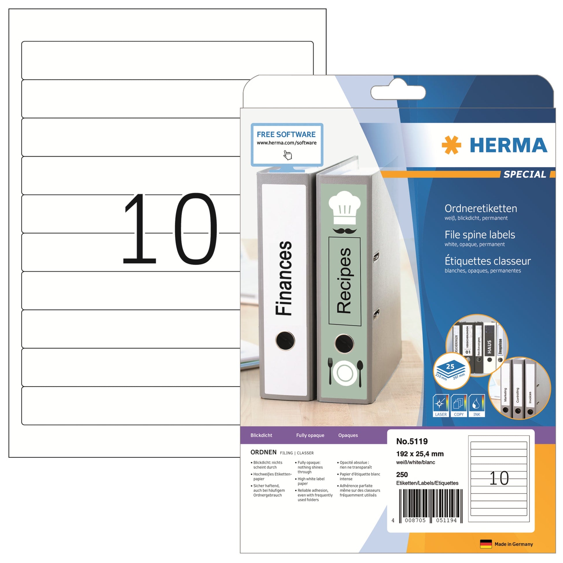 Bezeichnung: HERMA Ordnerrückenetikett schmal/kurz 25,4 x 192 mm (B x H) selbstklebend ohne Griffloch weiß 250 Etik./Pack.