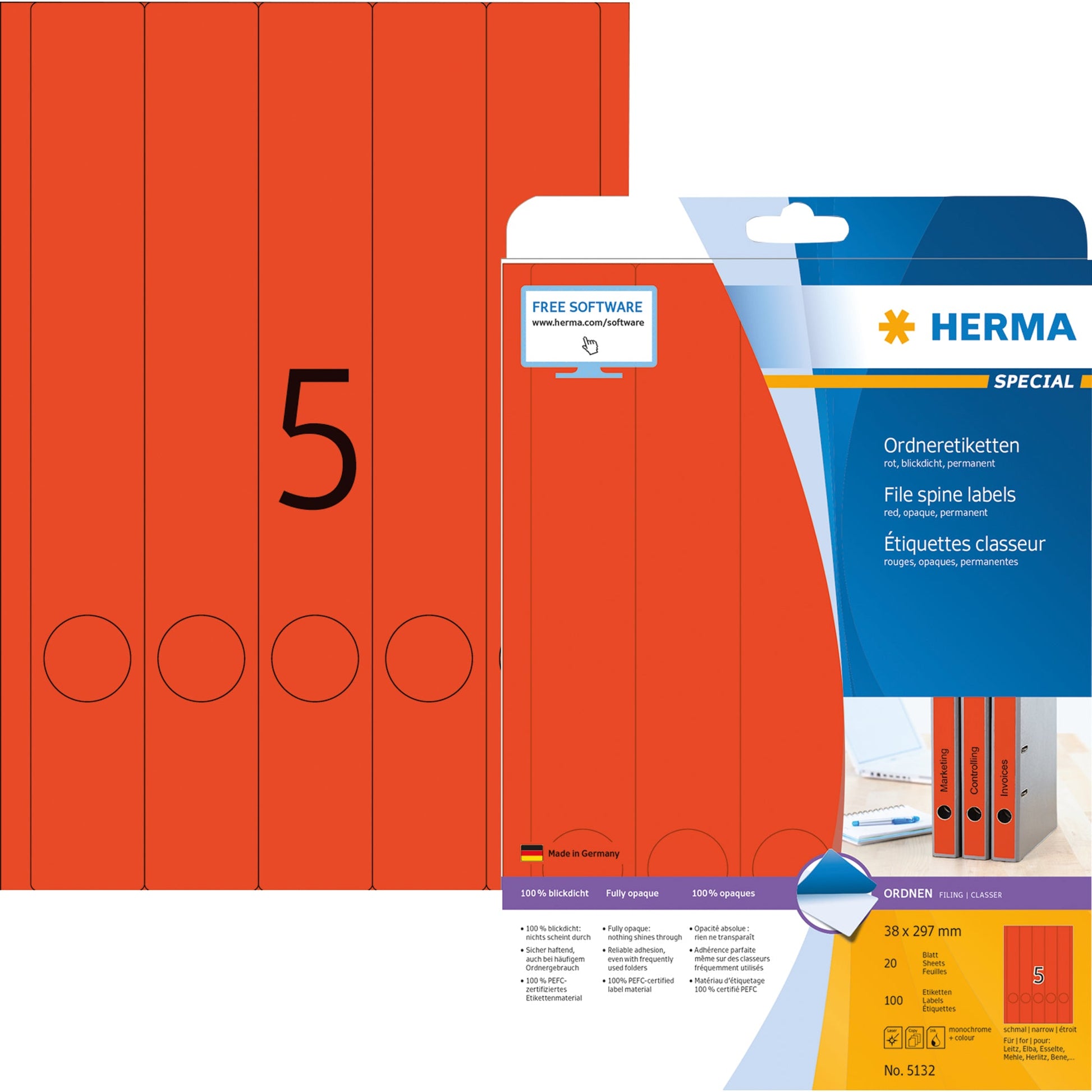 Bezeichnung: HERMA Ordnerrückenetikett schmal/lang 38 x 297 mm (B x H) selbstklebend mit Griffloch rot 100 Etik./Pack.