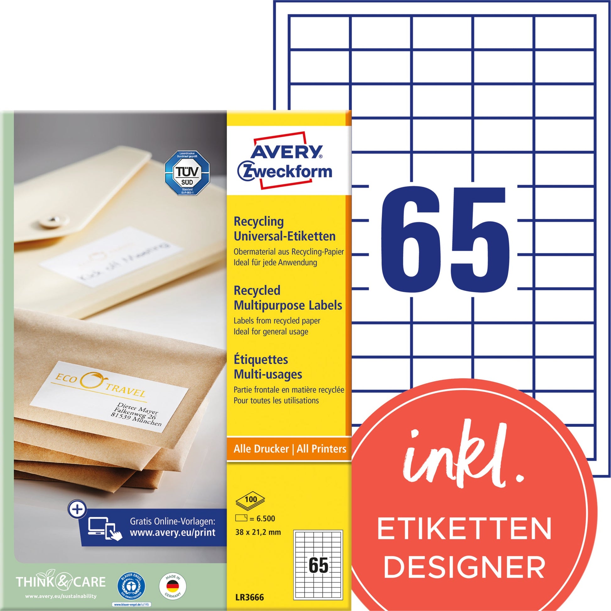Bezeichnung: Avery Zweckform Universaletikett Recycling 38 x 21,2 mm (B x H) nicht wieder ablösbar 100 % Altpapier naturweiß 6.500 Etik./Pack.