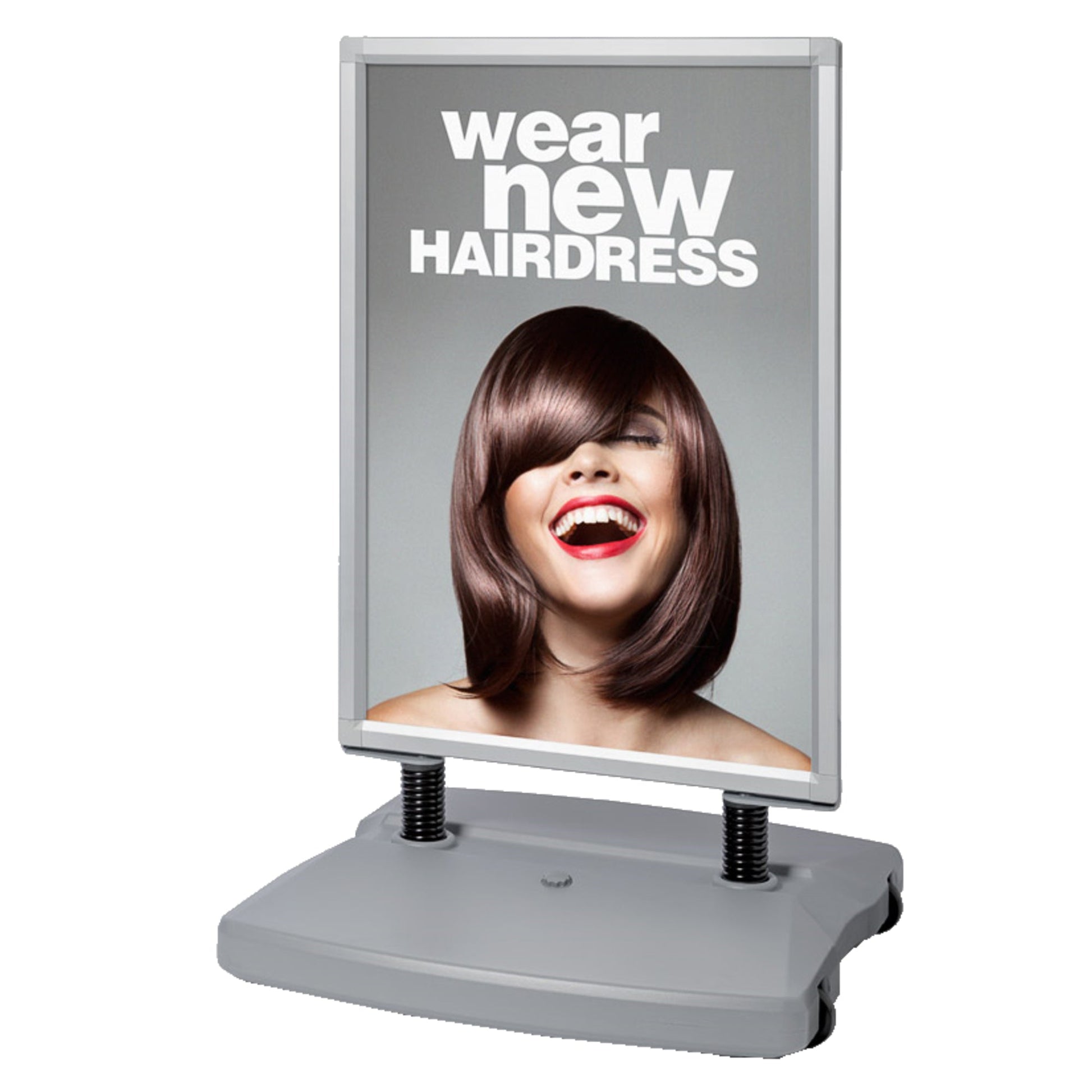 Bezeichnung: Showdown® Displays Kundenstopper Windtalker® City 83,5 x 130,8 x 83,5 cm (B x H x T) 70 x 100 cm (B x H) Standfuß