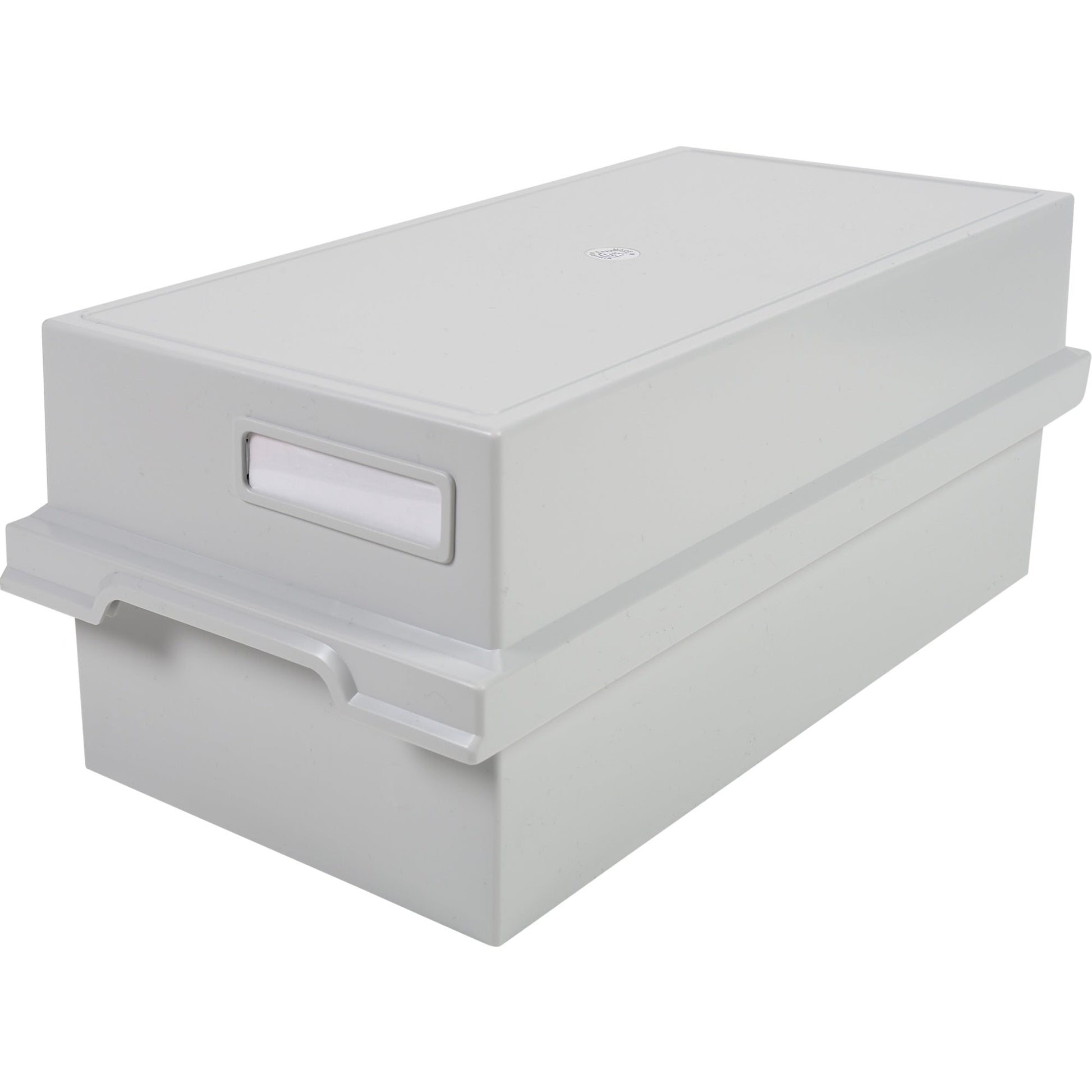 lichtgrauKarteikasten mit Schnappverbindung. Der Deckel ist leicht abnehmbar, sodass der Trog platzsparend in den Deckel gestellt werden kann (ausg. DIN A4).