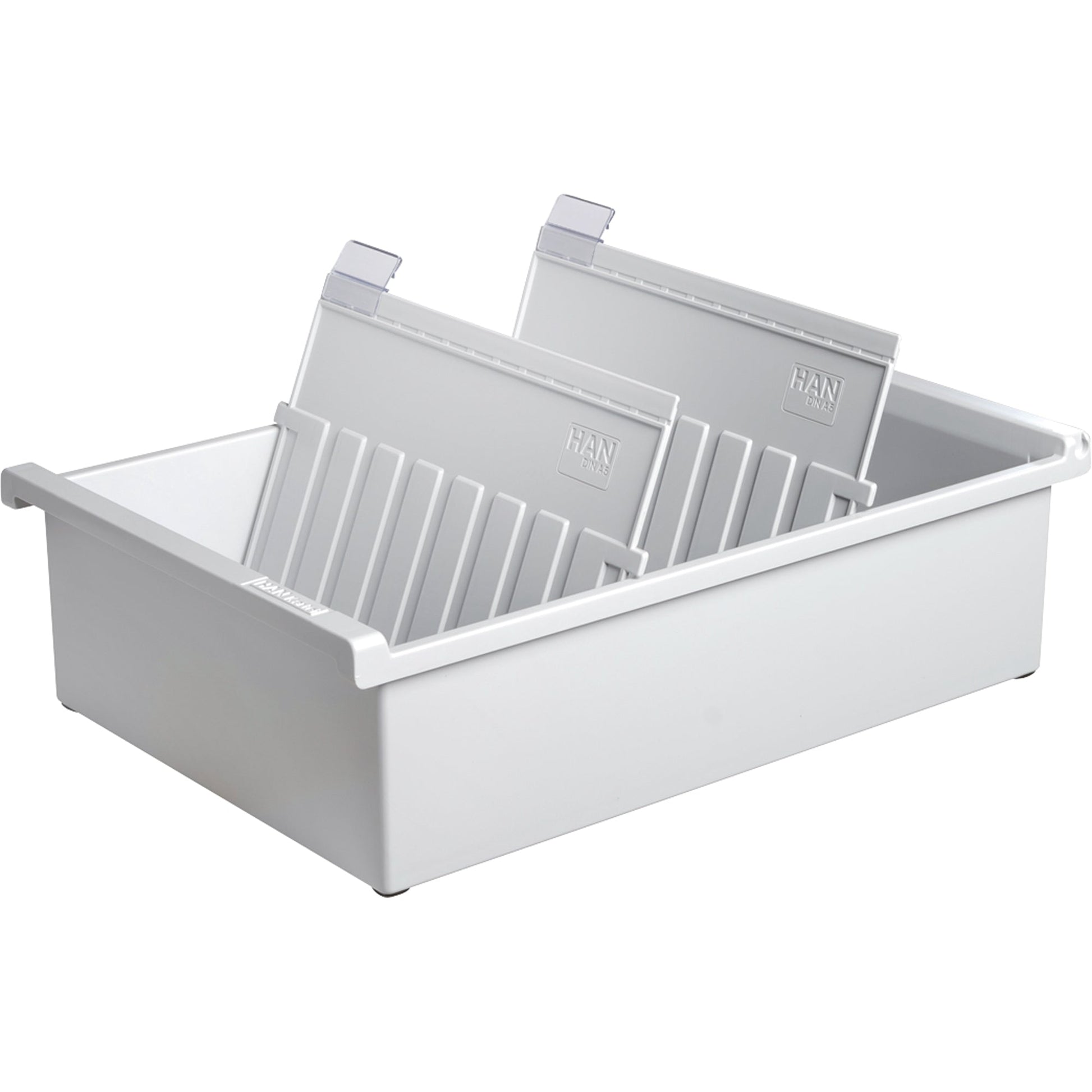 Bezeichnung: HAN Karteitrog 22,8 x 9,6 x 34,6 cm (B x H x T) DIN A5 quer 1.300 Karten Polystyrol lichtgrau 2 Stützplatten